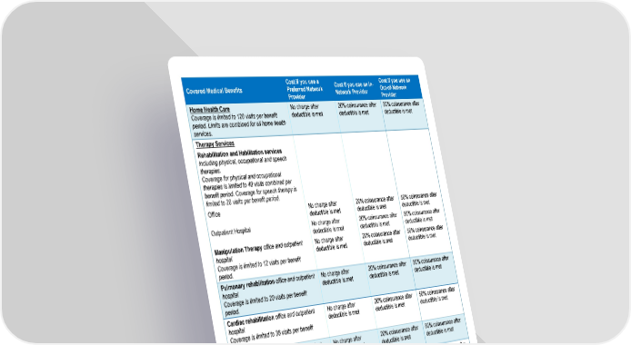 Richmond Community School Trust HealthSync Opt POS HSA 3 Tier Opt E2 Rx Carved out-Custom Page 4 of 7 Covered Medical Benefits Cost if you use a Preferred Network Provider Cost if you use an In- Network Provider Cost if you use an Out-of-Network Provider Home Health Care Coverage is limited to 120 visits per benefit period. Limits are combined for all home health services. No charge after deductible is met 20% coinsurance after deductible is met 50% coinsurance after deductible is met Therapy Services Rehabilitation and Habilitation services including physical, occupational and speech therapies. Coverage for physical and occupational therapies is limited to 40 visits combined per benefit period. Coverage for speech therapy is limited to 20 visits per benefit period. Office No charge after deductible is met 20% coinsurance after deductible is met 50% coinsurance after deductible is met Outpatient Hospital No charge after deductible is met 20% coinsurance after deductible is met 50% coinsurance after deductible is met Manipulation Therapy office and outpatient hospital Coverage is limited to 12 visits per benefit period. No charge after deductible is met 20% coinsurance after deductible is met 50% coinsurance after deductible is met Pulmonary rehabilitation office and outpatient hospital Coverage is limited to 20 visits per benefit period. No charge after deductible is met 20% coinsurance after deductible is met 50% coinsurance after deductible is met Cardiac rehabilitation office and outpatient hospital Coverage is limited to 36 visits per benefit period. No charge after deductible is met 20% coinsurance after deductible is met 50% coinsurance after deductible is met Dialysis/Hemodialysis office and outpatient hospital No charge after deductible is met 20% coinsurance after deductible is met 50% coinsurance after deductible is met Chemo/Radiation Therapy office and outpatient hospital No charge after deductible is met 20% coinsurance after deductible is met 50% coinsurance after deductible is met Skilled Nursing Care (facility) Coverage for Skilled Nursing, Outpatient Rehabilitation and Inpatient Rehabilitation facility settings is limited to 150 days combined per benefit period. No charge after deductible is met $500 copay per admission and 20% coinsurance after deductible is met 50% coinsurance after deductible is met Inpatient Hospice No charge after deductible is met Same as In-Network Tier 1 Covered as In-Network Additional Services, Equipment and Devices Durable Medical Equipment No charge after deductible is met 20% coinsurance after deductible is met 50% coinsurance after deductible is met
