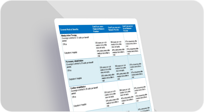 Richmond Community School Trust HealthSync Options POS 3 Tier Option 4 Rx Carved out -Custom Page 5 of 9 Covered Medical Benefits Cost if you use a Preferred Network Provider Cost if you use an In- Network Provider Cost if you use an Out-of-Network Provider Manipulation Therapy Coverage is limited to 12 visits per benefit period. Office $30 copay per visit medical deductible does not apply $80 copay per visit medical deductible does not apply 50% coinsurance after medical deductible is met Outpatient Hospital 20% coinsurance after medical deductible is met 40% coinsurance after medical deductible is met 50% coinsurance after medical deductible is met Pulmonary rehabilitation Coverage is limited to 20 visits per benefit period. Office $30 copay per visit medical deductible does not apply $80 copay per visit medical deductible does not apply 50% coinsurance after medical deductible is met Outpatient Hospital 20% coinsurance after medical deductible is met 40% coinsurance after medical deductible is met 50% coinsurance after medical deductible is met Cardiac rehabilitation Coverage is limited to 36 visits per benefit period. Office $30 copay per visit medical deductible does not apply $80 copay per visit medical deductible does not apply 50% coinsurance after medical deductible is met Outpatient Hospital 20% coinsurance after medical deductible is met 40% coinsurance after medical deductible is met 50% coinsurance after medical deductible is met Dialysis/Hemodialysis Office No charge No charge 50% coinsurance after medical deductible is met Outpatient Hospital 20% coinsurance after medical deductible is met 40% coinsurance after medical deductible is met 50% coinsurance after medical deductible is met Chemo/Radiation Therapy Office $30 copay per visit medical deductible does not apply‡ $80 copay per visit medical deductible does not apply‡ 50% coinsurance after medical deductible is met Outpatient Hospital 20% coinsurance after medical deductible is met 40% coinsurance after medical deductible is met 50% coinsurance after medical deductible is met