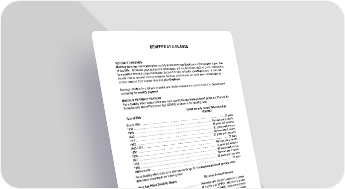 BENEFITS AT A GLANCE HC13GPIN 4 B-21113 (11/25) MONTHLY EARNINGS Monthly earnings means your gross monthly income from your Employer in effect just prior to your date of disability. It includes your total income before taxes, and any deductions made for pre-tax contributions to a qualified deferred compensation plan, Section 125 plan, or flexible spending account. It does not include income received from commissions, bonuses, overtime pay, any other extra compensation, or income received from sources other than your Employer. Earnings, whether for a full year or partial year, will be converted to a monthly amount for the purpose of calculating the monthly payment. MAXIMUM PERIOD OF PAYMENT For a disability which begins before you reach age 60, the maximum period of payment will be until the Social Security Normal Retirement Age (SSNRA) as shown in the following table: Year of Birth Social Security Normal Retirement Age (SSNRA)* Before 1938 ................................................................................................................................... 65 years 1938 ....................................................................................................................... 65 years and 2 months 1939 ....................................................................................................................... 65 years and 4 months 1940 ....................................................................................................................... 65 years and 6 months 1941 ....................................................................................................................... 65 years and 8 months 1942 ..................................................................................................................... 65 years and 10 months 1943-1954 ..................................................................................................................................... 66 years 1955 ....................................................................................................................... 66 years and 2 months 1956 ....................................................................................................................... 66 years and 4 months 1957 ....................................................................................................................... 66 years and 6 months 1958 ....................................................................................................................... 66 years and 8 months 1959 ..................................................................................................................... 66 years and 10 months 1960 and after ............................................................................................................................... 67 years For a disability which starts on or after you reach age 60, the maximum period of payment will be determined according to the following table: Your Age When Disability Begins Maximum Period of Payment Age 60 ............................................................................... 60 months or to SSNRA*, whichever is greater Age 61 ............................................................................... 48 months or to SSNRA*, whichever is greater Age 62 ............................................................................... 42 months or to SSNRA*, whichever is greater Age 63 ............................................................................... 36 months or to SSNRA*, whichever is greater Age 64 ............................................................................... 30 months or to SSNRA*, whichever is greater Age 65 ........................................................................................................................................ 24 months Age 66 ........................................................................................................................................ 21 months Age 67 ........................................................................................................................................ 18 months Age 68 ........................................................................................................................................ 15 months Age 69 and over ......................................................................................................................... 12 months *Age at which you are entitled to unreduced Social Security benefits based on the Social Security Amendments of 1983. REGULAR OCCUPATION PERIOD 3 Year(s)