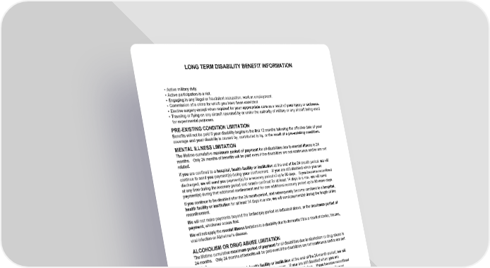 LONG TERM DISABILITY BENEFIT INFORMATION HC13GPIN 18 B-21113 (11/25) • Active military duty. • Active participation in a riot. • Engaging in any illegal or fraudulent occupation, work or employment. • Commission of a crime for which you have been convicted. • Elective surgery except when required for your appropriate care as a result of your injury or sickness. • Traveling or flying on any aircraft operated by or under the authority of military or any aircraft being used for experimental purposes. PRE-EXISTING CONDITION LIMITATION Benefits will not be paid if your disability begins in the first 12 months following the effective date of your coverage and your disability is caused by, contributed to by, or the result of a pre-existing condition. MENTAL ILLNESS LIMITATION The lifetime cumulative maximum period of payment for all disabilities due to mental illness is 24 months. Only 24 months of benefits will be paid even if the disabilities are not continuous and/or are not related. If you are confined to a hospital, health facility or institution at the end of the 24 month period, we will continue to send you payment(s) during your confinement. If you are still disabled when you are discharged, we will send you payment(s) for a recovery period of up to 90 days. If you become reconfined at any time during the recovery period and remain confined for at least 14 days in a row, we will send payment(s) during that additional confinement and for one additional recovery period up to 90 more days. If you continue to be disabled after the 24 month period, and subsequently become confined to a hospital, health facility or institution for at least 14 days in a row, we will send payment(s) during the length of the reconfinement. We will not make payments beyond the limited pay period as indicated above, or the maximum period of payment, whichever occurs first. We will not apply the mental illness limitation to a disability due to dementia if it is a result of stroke, trauma, viral infection or Alzheimer's disease. ALCOHOLISM OR DRUG ABUSE LIMITATION The lifetime cumulative maximum period of payment for all disabilities due to alcoholism or drug abuse is 24 months. Only 24 months of benefits will be paid even if the disabilities are not continuous and/or are not related. If you are confined to a hospital, health facility or institution at the end of the 24 month period, we will continue to send you payment(s) during your confinement. If you are still disabled when you are discharged, we will send you payment(s) for a recovery period of up to 90 days. If you become reconfined at any time during the recovery period and remain confined for at least 14 days in a row, we will send payment(s) during that additional confinement and for one additional recovery period up to 90 more days. If you continue to be disabled after the 24 month period, and subsequently become confined to a hospital, health facility or institution for at least 14 days in a row, we will send payment(s) during the length of the reconfinement. We will not make payments beyond the limited pay period as indicated above, or the maximum period of payment, whichever occurs first. SPECIAL CONDITIONS LIMITATION The lifetime cumulative maximum period of payment for all disabilities due to special conditions is 24 months. Only 24 months of benefits will be paid for any combination of such disabilities even if the disabilities are not continuous and/or are not related. If you are confined to a hospital, health facility or institution at the end of the 24 month period, we will continue to send you payment(s) during your confinement. If you are still disabled when you are