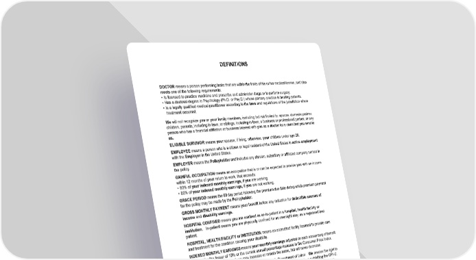 DEFINITIONS HC13GPIN 7 B-21113 (11/25) DOCTOR means a person performing tasks that are within the limits of his or her medical license, and also meets one of the following requirements: • Is licensed to practice medicine and prescribe and administer drugs or to perform surgery. • Has a doctoral degree in Psychology (Ph.D. or Psy.D.) whose primary practice is treating patients. • Is a legally qualified medical practitioner according to the laws and regulations of the jurisdiction where treatment occurred. We will not recognize you or your family members, including but not limited to: spouse, domestic partner, children, parents, including in-laws, or siblings, including in-laws, a business or professional partner, or any person who has a financial affiliation or business interest with you as a doctor for a claim that you send to us. ELIGIBLE SURVIVOR means your spouse, if living; otherwise, your children under age 26. EMPLOYEE means a person who is a citizen or legal resident of the United States in active employment with the Employer in the United States. EMPLOYER means the Policyholder and includes any division, subsidiary or affiliated company named in the policy. GAINFUL OCCUPATION means an occupation that is or can be expected to provide you with an income within 12 months of your return to work, that exceeds: • 80% of your indexed monthly earnings, if you are working. • 80% of your indexed monthly earnings, if you are not working. GRACE PERIOD means the 60 day period following the premium due date during which premium payment for the policy may be made by the Policyholder. GROSS MONTHLY PAYMENT means your benefit before any reduction for deductible sources of income and disability earnings. HOSPITAL CONFINED means you are confined as an in-patient in a hospital, health facility or institution. In-patient means you are physically confined for an overnight stay, as a registered bed patient. HOSPITAL, HEALTH FACILITY or INSTITUTION means an accredited facility licensed to provide care and treatment for the condition causing your disability. INDEXED MONTHLY EARNINGS means your monthly earnings adjusted on each anniversary of benefit payment by the lesser of 10% or the current annual percentage increase in the Consumer Price Index. Your indexed monthly earnings may increase or remain the same, but will never decrease. The Consumer Price Index CPI-U is published by the U.S. Department of Labor. We reserve the right to use some other similar measurement if the Department of Labor changes or stops publishing the CPI-U. Indexing is only used as a factor in the determination of the percentage of lost earnings while you are disabled and working, and in the determination of gainful occupation. INJURY means a bodily injury that is the direct result of an accident and not related to any other cause. The injury must occur, and disability resulting from the injury must begin, while you are covered under the policy. Injury that occurs before you are covered under the policy will be treated as a sickness. INSURED PERSON means a person who is eligible for the coverage under the policy, becomes covered according to the terms of the policy, and whose coverage remains in effect according to the terms of the policy. LAW, PLAN or ACT means the original enactments of the law, plan or act and all amendments. LEAVE OF ABSENCE means you are absent from active employment for a period of time that has been agreed to in advance in writing by your Employer. Your normal vacation time or any period of disability is not considered a leave of absence.