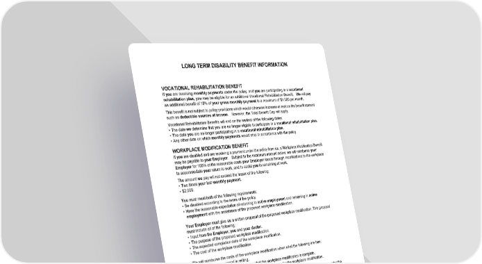 LONG TERM DISABILITY BENEFIT INFORMATION HC13GPIN 21 B-21114 (11/25) VOCATIONAL REHABILITATION BENEFIT If you are receiving monthly payments under the policy, and you are participating in a vocational rehabilitation plan, you may be eligible for an additional Vocational Rehabilitation Benefit. We will pay an additional benefit of 10% of your gross monthly payment to a maximum of $1,000 per month. This benefit is not subject to policy provisions which would otherwise increase or reduce the benefit amount such as deductible sources of income. However, the Total Benefit Cap will apply. Vocational Rehabilitation Benefits will end on the earliest of the following dates: • The date we determine that you are no longer eligible to participate in a vocational rehabilitation plan. • The date you are no longer participating in a vocational rehabilitation plan. • Any other date on which monthly payments would stop in accordance with the policy. WORKPLACE MODIFICATION BENEFIT If you are disabled and are receiving a payment under the policy from us, a Workplace Modification Benefit may be payable to your Employer. Subject to the maximum amount below, we will reimburse your Employer for 100% of the reasonable costs your Employer incurs through modifications to the workplace to accommodate your return to work, and to assist you in remaining at work. The amount we pay will not exceed the lesser of the following: • Two times your last monthly payment. • $2,000. You must meet both of the following requirements: • Be disabled according to the terms of the policy. • Have the reasonable expectation of returning to active employment and remaining in active employment with the assistance of the proposed workplace modification. Your Employer must give us a written proposal of the proposed workplace modification. This proposal must include all of the following: • Input from the Employer, you and your doctor. • The purpose of the proposed workplace modification. • The expected completion date of the workplace modification. • The cost of the workplace modification. We will reimburse the costs of the workplace modification when all of the following are true: • We approve the proposal in writing. • We receive proof from your Employer that the workplace modification is complete. • We receive proof of the costs incurred by your Employer for the workplace modification. The Workplace Modification Benefit is available on a one-time basis for each insured person under the policy. SURVIVOR BENEFIT When we receive proof that you have died, we will pay your eligible survivor a lump sum benefit equal to three (3) times your gross monthly payment if, on the date of your death, both of the following are true: • Your disability had continued for 180 or more consecutive days. • You were receiving or were eligible to receive payments under the policy. If you have no eligible survivors, payment will be made to your estate, unless there is none. In this case, no payment will be made. However, we will first apply the Survivor Benefit to recover any overpayment that may exist on your claim.
