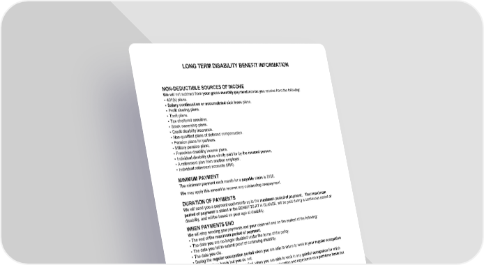 LONG TERM DISABILITY BENEFIT INFORMATION HC13GPIN 17 B-21114 (11/25) NON-DEDUCTIBLE SOURCES OF INCOME We will not subtract from your gross monthly payment income you receive from the following: • 401(k) plans. • Salary continuation or accumulated sick leave plans. • Profit sharing plans. • Thrift plans. • Tax-sheltered annuities. • Stock ownership plans. • Credit disability insurance. • Non-qualified plans of deferred compensation. • Pension plans for partners. • Military pension plans. • Franchise disability income plans. • Individual disability plans wholly paid for by the insured person. • A retirement plan from another employer. • Individual retirement accounts (IRA). MINIMUM PAYMENT The minimum payment each month for a payable claim is $100. We may apply this amount to recover any outstanding overpayment. DURATION OF PAYMENTS We will send you a payment each month up to the maximum period of payment. Your maximum period of payment is stated in the BENEFITS AT A GLANCE, will be paid during a continuous period of disability, and will be based on your age at disability. WHEN PAYMENTS END We will stop sending you payments and your claim will end on the earliest of the following: • The end of the maximum period of payment. • The date you are no longer disabled under the terms of the policy. • The date you fail to submit proof of continuing disability. • The date you die. • During the regular occupation period when you are able to return to work in your regular occupation on a part-time basis but you do not. • After the regular occupation period, when you are able to work in any gainful occupation for which you are reasonably qualified based on your training, education and experience on a part-time basis but you do not. • The date your disability earnings exceed 80% of your indexed monthly earnings. • After 12 months of payments if you are considered to reside outside the United States or Canada. You will be considered to reside outside these countries when you have been outside the United States or Canada for a total period of 6 months or more during any 12 consecutive months of benefits. We will not pay a benefit for any period of disability during which you are incarcerated. DISABILITIES NOT COVERED UNDER THE POLICY The policy does not cover any disabilities caused by, contributed by, or resulting from your: • Loss of professional license, occupational license or certification. • Commission of or attempt to commit a felony. • Intentionally self-inflicted injuries. • Attempted suicide, regardless of mental capacity. • Being legally intoxicated or being under the influence of any narcotic, unless the narcotic is taken under the direction of and as directed by a doctor. • Participation in a war, declared or undeclared, or any act of war.