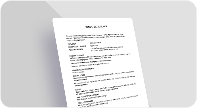 BENEFITS AT A GLANCE HC13GPIN 3 B-21114 (11/25) The Long Term Disability policy provides benefits to replace a portion of your income while you are disabled. The amount you receive is based on the amount you earned before your disability began, subject to all policy provisions. EMPLOYER: Noblesville Schools GROUP POLICY NUMBER: 73058-1LTD ACCOUNT NUMBER: Certified Employees and Classified Employees, excluding Bus Drivers, working 30 hours or more per week ELIGIBLE CLASS(ES) All Certified Employees and Classified Employees, excluding Bus Drivers, working 30 hours or more per week in active employment with the Employer in the United States. You must be an employee of the Employer and in an eligible class. Temporary and seasonal workers are excluded from coverage. MINIMUM HOURS REQUIREMENT 30 hours per week WAITING PERIOD For persons in an eligible class on or before the policy effective date: End of the month in which you begin active employment. For persons entering an eligible class after the policy effective date: End of the month in which you begin active employment. REHIRE If your employment ends and you are rehired within 90 days, your previous work while in an eligible class will apply toward the waiting period. All other policy provisions apply. WHO PAYS FOR THE COVERAGE Your Employer pays the cost of your coverage. WAIVER OF PREMIUM We do not require premium payments for your coverage while you are receiving or are entitled to receive Long Term Disability payments under the policy. ELIMINATION PERIOD The latest of the following: • 90 consecutive days for disability due to injury. • 90 consecutive days for disability due to sickness. • The date your salary continuation or accumulated sick leave payments end, if applicable. The elimination period begins on the first day of your disability. Benefits for a payable claim begin the day after the elimination period is completed. ACCUMULATION OF ELIMINATION PERIOD Accumulation period: 180 consecutive days. The elimination period and the accumulation period begin on the first day of your disability. Benefits for a payable claim begin the day after the elimination period is completed. MONTHLY BENEFIT 66.7% of monthly earnings to a maximum benefit of $5,000 per month. Your benefit may be reduced by any deductible sources of income and disability earnings. Some disabilities may not be covered or may have limited coverage under the policy.