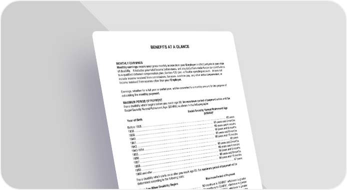 BENEFITS AT A GLANCE HC13GPIN 4 B-21114 (11/25) MONTHLY EARNINGS Monthly earnings means your gross monthly income from your Employer in effect just prior to your date of disability. It includes your total income before taxes, and any deductions made for pre-tax contributions to a qualified deferred compensation plan, Section 125 plan, or flexible spending account. It does not include income received from commissions, bonuses, overtime pay, any other extra compensation, or income received from sources other than your Employer. Earnings, whether for a full year or partial year, will be converted to a monthly amount for the purpose of calculating the monthly payment. MAXIMUM PERIOD OF PAYMENT For a disability which begins before you reach age 60, the maximum period of payment will be until the Social Security Normal Retirement Age (SSNRA) as shown in the following table: Year of Birth Social Security Normal Retirement Age (SSNRA)* Before 1938 ................................................................................................................................... 65 years 1938 ....................................................................................................................... 65 years and 2 months 1939 ....................................................................................................................... 65 years and 4 months 1940 ....................................................................................................................... 65 years and 6 months 1941 ....................................................................................................................... 65 years and 8 months 1942 ..................................................................................................................... 65 years and 10 months 1943-1954 ..................................................................................................................................... 66 years 1955 ....................................................................................................................... 66 years and 2 months 1956 ....................................................................................................................... 66 years and 4 months 1957 ....................................................................................................................... 66 years and 6 months 1958 ....................................................................................................................... 66 years and 8 months 1959 ..................................................................................................................... 66 years and 10 months 1960 and after ............................................................................................................................... 67 years For a disability which starts on or after you reach age 60, the maximum period of payment will be determined according to the following table: Your Age When Disability Begins Maximum Period of Payment Age 60 ............................................................................... 60 months or to SSNRA*, whichever is greater Age 61 ............................................................................... 48 months or to SSNRA*, whichever is greater Age 62 ............................................................................... 42 months or to SSNRA*, whichever is greater Age 63 ............................................................................... 36 months or to SSNRA*, whichever is greater Age 64 ............................................................................... 30 months or to SSNRA*, whichever is greater Age 65 ........................................................................................................................................ 24 months Age 66 ........................................................................................................................................ 21 months Age 67 ........................................................................................................................................ 18 months Age 68 ........................................................................................................................................ 15 months Age 69 and over ......................................................................................................................... 12 months *Age at which you are entitled to unreduced Social Security benefits based on the Social Security Amendments of 1983. REGULAR OCCUPATION PERIOD 3 Year(s)