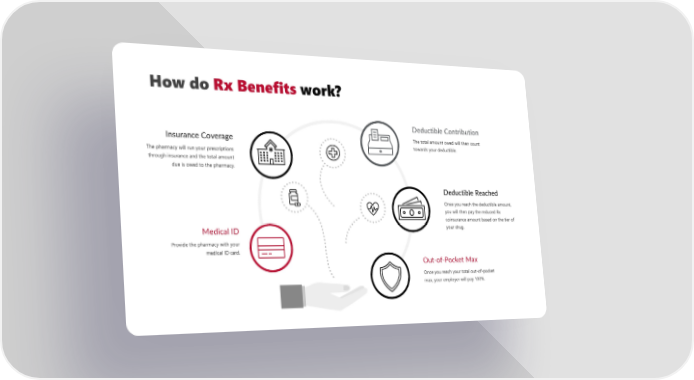 How do Rx Benefits work? Medical ID Provide the pharmacy with your medical ID card. Insurance Coverage The pharmacy will run your prescriptions through insurance and the total amount due is owed to the pharmacy. Deductible Reached Once you reach the deductible amount, you will then pay the reduced Rx coinsurance amount based on the tier of your drug. Deductible Contribution The total amount owed will then count towards your deductible. Out-of-Pocket Max Once you reach your total out-of-pocket max, your employer will pay 100%.