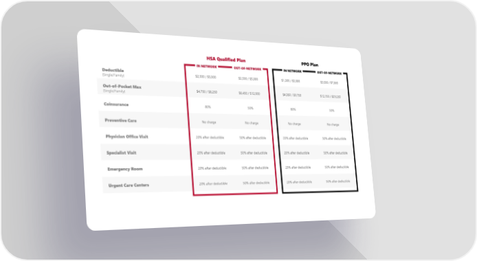 HSA Qualified Plan PPO Plan IN NETWORK OUT-OF-NETWORK IN NETWORK OUT-OF-NETWORK Deductible (Single/Family) $2,500 / $5,000 $2,500 / $5,000 $1,300 / $3,900 $2,600 / $7,800 Out-of-Pocket Max (Single/Family) $4,750 / $8,250 $6,450 / $12,900 $4,050 / $9,750 $12,150 / $29,250 Coinsurance 80% 50% 80% 50% Preventive Care No charge No charge No charge No charge Physician Office Visit 20% after deductible 50% after deductible 20% after deductible 50% after deductible Specialist Visit 20% after deductible 50% after deductible 20% after deductible 50% after deductible Emergency Room 20% after deductible 50% after deductible 20% after deductible 50% after deductible Urgent Care Centers 20% after deductible 50% after deductible 20% after deductible 50% after deductible