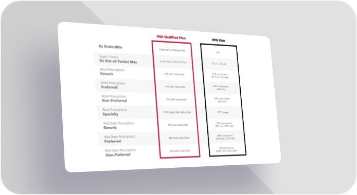 HSA Qualified Plan PPO Plan Rx Deductible Integrated w/ Medical Plan N/A Single / Family Rx Out-of-Pocket Max Integrated w/ Medical Plan $1,725 / $3,450 Retail Prescriptions: Generic 20% after deductible 20% coinsurance ($7 min / $25 max) Retail Prescriptions: Preferred 40% after deductible 40% coinsurance ($35 min) Retail Prescriptions: Non-Preferred 50% after deductible 50% coinsurance ($60 min) Retail Prescriptions: Specialty $110 copay after deductible $110 copay Mail Order Prescriptions: Generic 20% after deductible 20% coinsurance ($15 min / $65 max) Mail Order Prescriptions: Preferred 40% after deductible 40% coinsurance ($70 min / $110 max) Mail Order Prescriptions: Non-Preferred 50% after deductible 50% coinsurance ($120 min / $160 max)