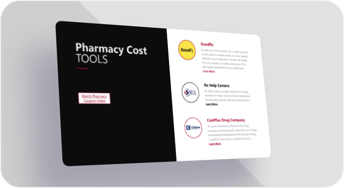 Pharmacy Cost TOOLS GoodRx GoodRx has both a website and a mobile app that can be used to compare prices. Go to the website and type in your drug name. GoodRx will display the cost available at multiple pharmacies. Print the coupon and present to your pharmacist. Learn More Rx Help Centers RX Help Centers provides assistance in finding resources for high-cost brand name medications by advocating directly with drug manufacturers. Learn More CostPlus Drug Company The goal of the Mark Cuban Cost Plus Drug Company is to dramatically reduce the cost of drugs and introduce transparency to the pricing of drugs, so patients know they are getting a fair price. Learn More Watch Pharmacy Coupon Video