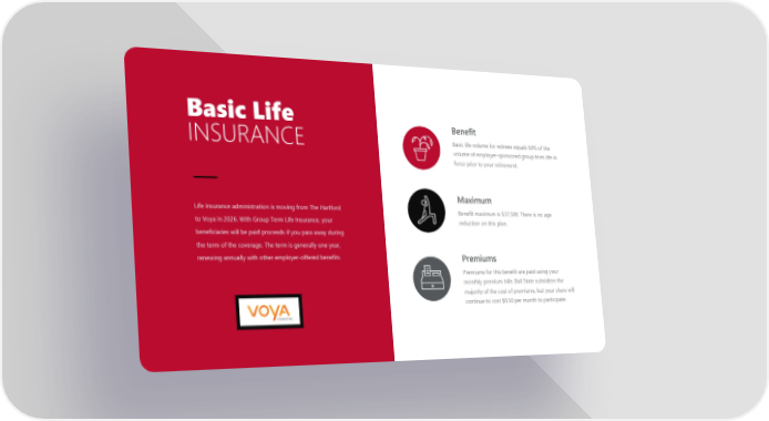 Life insurance administration is moving from The Hartford to Voya in 2026. With Group Term Life Insurance, your beneficiaries will be paid proceeds if you pass away during the term of the coverage. The term is generally one year, renewing annually with other employer-offered benefits. Basic Life INSURANCE Benefit Basic life volume for retirees equals 50% of the volume of employer-sponsored group term life in force prior to your retirement. Maximum Benefit maximum is $37,500. There is no age reduction on this plan. Premiums Premiums for this benefit are paid using your monthly premium bills. Ball State subsidizes the majority of the cost of premiums, but your share will continue to cost $8.50 per month to participate.