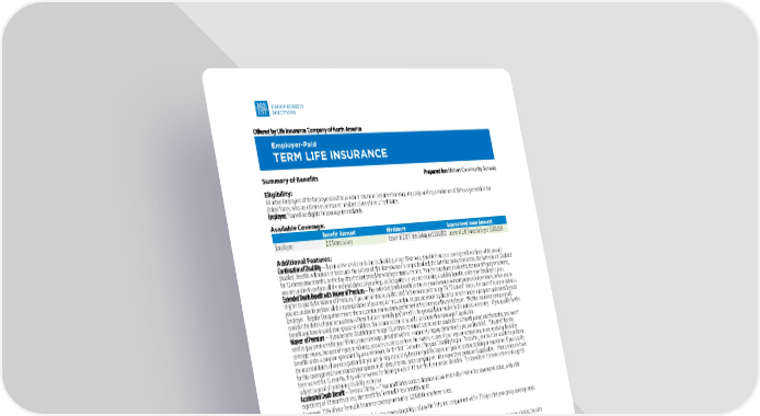 Offered by Life Insurance Company of North America Employer-Paid TERM LIFE INSURANCE Summary of Benefits Prepared for: Elkhart Community Schools Eligibility: All active Employees of the Employer classified as Administrator or Executive Secretary, regularly working a minimum of 30 hours per week in the United States, who are citizens or permanent resident aliens of the United States. Employee:You will be eligible for coverage immediately. AvailableCoverage: Benefit Amount Maximum Guaranteed Issue Amount Employee 2.0 Times Salary Lesser of 2.0 Times Salary or $500,000 Lesser of 2.0 Times Salary or $500,000 Additional Features: Continuation of Disability – If your active service ends due to disability, at age 60 or over, your life insurance coverage will continue while you are disabled. Benefits will remain in force until the earliest of: the date you are no longer disabled, the date the policy terminates, the date you are Disabled for 12 consecutive months, or the day after the last period for which premiums are paid. You are considered disabled if, because of injury or sickness, you are unable to perform all the material duties of your Regular Occupation, or you are receiving disability benefits under your Employer’s plan. Extended Death Benefit with Waiver of Premium – The extended death benefit continues your coverage without payment of premium, before you’re eligible to qualify for Waiver of Premium, if you are continuously Disabled for 6 months prior to age 70. “Disabled” means, because of injury or sickness, you are unable to perform all the material duties of your regular occupation, or you are receiving disability benefits under a program sponsored by your Employer. Regular Occupation means the occupation you routinely performed at the time your Disability began. We/the insurance company will consider the duties of your occupation as those that are normally performed in the general labor market in the national economy. If you qualify for this benefit and have insured your spouse or children, the insurance company will also extend their coverage if applicable. Waiver of Premium – If you become Disabled prior to age 70, and you remain Disabled continuously for a 6 month period and thereafter, you won’t need to pay premiums for your life insurance coverage, provided we/the Insurance Company determine(s) you are Disabled. “Disabled” for this coverage means, because of injury or sickness, you are unable to perform the material duties of your regular occupation, or are receiving disability benefits under a program sponsored by your employer, for the first 12 months after your Disability began. Thereafter, you must be unable to perform the material duties of any occupation that you are or may reasonably become qualified based on your education, training or experience. If you qualify for this coverage and have insured your spouse or children, the insurance company will also waive their premium if applicable. After premiums have been waived for 12 months, they will be waived for future periods of 12 months if you remain Disabled. This benefit will remain active until age 65 subject to proof of continuing disability each year. Accelerated Death Benefit – Terminal Illness – if two unaffiliated doctors diagnose you as terminally ill while the coverage is active, with a life expectancy of 12 months or less, the benefit for Terminal Illness provides up to: Employee:75% of your Term Life Insurance coverage amount or $250,000, whichever is less. Conversion – To convert, you must apply for the conversion policy and pay the first premium payment within 31 days after your group coverage ends. Important Definitions and Policy Provisions: WhenYourCoverageBeginsandEnds– Coverage becomes effective on the later of the program’s effective date, the date you become eligible, the date your enrollment elections are received if applicable, or the date you authorize any necessary payroll deductions if applicable. Your coverage will not begin unless you are actively at work on the effective date. Dependent coverage, if applicable, will not begin for any spouse or child who on the effective date is an inpatient in a facility or is home confined and under the care of a physician. Coverage will end on the earliest of the date you are eligible for coverage under a plan intended to replace this coverage, you or your dependents if applicable, are no longer eligible, the group policy is no longer in force, or required premiums are not paid. Benefit Reductions, Exclusions and Limitations: Benefit Reduction Schedule - If you are still employed, your benefits will reduce to 65% at age 65, 45% at age 70, 30% at age 75 and 20% at age 80. Limitations - The Accelerated Death Benefit is payable only once. Using this benefit reduces the life insurance death benefit. The amount payable under the Accelerated Death Benefit may be reduced by the amount of other benefits already paid to the insured under the policy. See your certificate for details. Benefits will be extended without premium payment until the earlier of the date you are no longer disabled, or the date you fail to qualify for Waiver of Premium or fail to provide proof of Disability.
