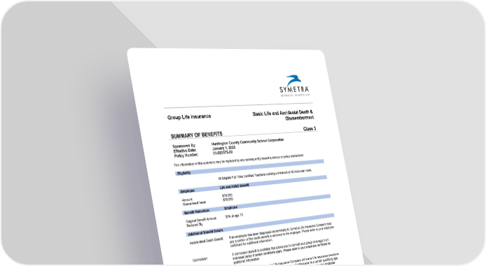 Group Life Insurance Basic Life and Accidental Death & Dismemberment SUMMARY OF BENEFITS Class 3 Sponsored By: Huntington County Community School Corporation Effective Date: January 1, 2023 Policy Number: 01-020575-00 The information in this summary may be replaced by any subsequently issued summary or policy amendment. Eligibility All Eligible Full-Time Certified Teachers working a minimum of 30 hours per week. Employee Life and AD&D Benefit Amount $70,000 Guaranteed Issue $70,000 Benefit Reduction Employee Original Benefit Amount 35% at age 70 Reduced By Additional Benefit Details Accelerated Death Benefit If an employee has been diagnosed as terminally ill, Symetra Life Insurance Company may pay a portion of the death benefit in advance to the employee. Please refer to your employee certificate for additional information. Conversion A conversion benefit is available that allows you to convert your group coverage to an individual policy if certain conditions apply. Please refer to your employee certificate for additional information. Waiver of Premium With proof of disability, Symetra Life Insurance Company will waive Life Insurance premiums for a period of time for an employee that becomes disabled prior to a certain qualifying age. Certain restrictions, such as an elimination period, apply. Please refer to your employee certificate for additional information. AD&D Riders Includes Seat Belt, Airbag, Repatriation, Child Education, Day Care, Rehabilitation, Spouse Education, Adaptive Home and Vehicle, Critical Burn, Therapeutic Counseling, Felonious Assault and Coma benefits. Please refer to your employee certificate for additional information. Value Added Services Beneficiary Companion Support services for beneficiaries who have experienced a loss. Travel Assist Travel assistance services for employees and eligible dependents traveling more than 100 miles from home. Identity Theft Protection Help is just a phone call away wherever employees travel, including lost wallet protection, translation service and emergency cash. This summary provides only a brief description of the Life Insurance coverage insured by Symetra Life Insurance Company under the LGC-13000 8/06 series Group Life Insurance policy. For a complete description, including all definitions, exclusions, limitations, and reductions in coverage, as well as information on termination of benefits, please contact your benefit administrator or refer to the Group Insurance Certificate you will receive when you become insured. Coverage will be offered under Group Policy number 01-020575-00. All benefits are subject to the terms and conditions of the Group Policy. If there is a difference between the information in this summary and the information contained in the Group Insurance Certificate, the terms of the Group Insurance Certificate will prevail. The terms of coverage may change over time; always refer to your current Group Insurance Certificate for information regarding your insurance benefits. Insured by Symetra Life Insurance Company Symetra® is a registered service mark of Symetra Life Insurance Company. LGP-2319/Basic-Class 3 2/17
