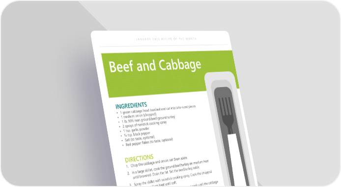 JANUARY 2025 RECIPE OF THE MONTH Beef and Cabbage INGREDIENTS • 1 green cabbage head (washed and cut into bite-sized pieces • 1 medium onion (chopped) • 1 lb. 90% lean ground beef/ground turkey • 2 sprays of nonstick cooking spray • 1 tsp. garlic powder • ¼ tsp. black pepper • Salt (to taste, optional) • Red pepper flakes (to taste, optional) DIRECTIONS 1. Chop the cabbage and onion; set them aside. 2. In a large skillet, cook the ground beef/turkey on medium heat until browned. Drain the fat. Set the beef/turkey aside. 3. Spray the skillet with nonstick cooking spray. Cook the chopped onion on medium heat until soft. 4. Add the cabbage to the chopped onion and cook until the cabbage starts to brown. 5. Stir the beef/turkey into the cabbage and onion mixture. 6. Season with garlic powder, black pepper and salt (optional). Add red pepper flakes (optional) to the cabbage if you like it spicy. Makes: 4 Servings NUTRITIONAL INFORMATION (1 Serving) Calories 248 Dietary Fiber 6 g Total fat 10 g Total sugars 8 g Saturated Fat 4 g Added Sugars Included 0 g Sodium 107 mg Protein 25 g Carbohydrate 16 g
