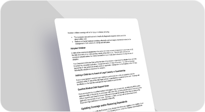 97 Newborn children coverage will be for injury or sickness, including: • The necessary care and treatment of medically diagnosed congenital defects and birth abnormalities; and • Medical and dental treatment (including orthodontic and oral surgery treatment) involved in the management of birth defects for cleft lip and cleft palate. Adopted Children A child will be considered adopted from the earlier of: (1) the moment of placement in your home; or (2) the date of an entry of an order granting custody of the child to you. The child will continue to be considered adopted unless the child is removed fr om your home prior to issuance of a legal decree of adoption. Your Dependent’s Effective Date will be the date of the adoption or placement for adoption if you send the Employer the completed application / change form within 31 days of the event. To continue coverage beyond the 31 day period you should submit an application / change form to the Employer, within 31 days following the adoption or placement for adoption. Adding a Child due to Award of Legal Custody or Guardianship If you or your spouse is awarded legal custody or guardianship for a child, an application must be submitted within 31 days of the date legal custody or guardianship is awarded by the court. Coverage will be effective on the date the court granted legal c ustody or guardianship. Qualified Medical Child Support Order If you are required by a qualified medical child support order or court order, as defined by ERISA and/or applicable state or federal law, to enroll your child in this Plan, we will permit the child to enroll at any time without regard to any Open Enrollme nt limits and will provide the benefits of this Plan according to the applicable requirements of such order. However, a child's coverage will not extend beyond any Dependent Age Limit listed in the Schedule of Benefits. Updating Coverage and/or Removing Dependents You are required to notify the Employer of any changes that affect your eligibility or the eligibility of your Dependents for this Plan. When any of the following occurs, contact the Employer and complete the appropriate forms: • Changes in address; • Marriage or divorce; • Death of an enrolled family member (a different type of coverage may be necessary); • Enrollment in another health plan or in Medicare; • Eligibility for Medicare; • Dependent child reaching the Dependent Age Limit (see “ Termination and Continuation of Coverage ”); • Enrolled Dependent child either becomes totally or permanently disabled, or is no longer disabled. Failure to notify the Employer of individuals no longer eligible for services will not obligate the Plan to cover such services, even if F ees are received for those individuals. All notifications must be in writing and on approved forms.