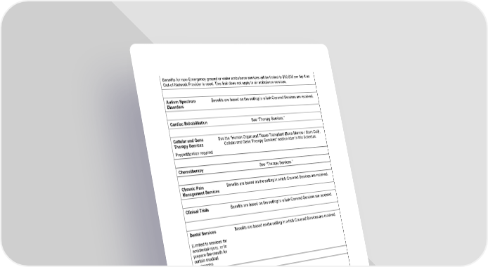 15 Benefits for non - Emergency ground or water ambulance services will be limited to $50,000 per trip if an Out - of - Network Provider is used. This limit does not apply to air ambulance services. Autism Spectrum Disorders Benefits are based on the setting in which Covered Services are received. Cardiac Rehabilitation See “Therapy Services.” Cellular and Gene Therapy Services Precertification required See the “Human Organ and Tissue Transplant (Bone Marrow / Stem Cell), Cellular and Gene Therapy Services” section later in this Schedule. Chemotherapy See “Therapy Services.” Chronic Pain Management Services Benefits are based on the setting in which Covered Services are received. Clinical Trials Benefits are based on the setting in which Covered Services are received. Dental Services (Limited to services for accidental injury, or to prepare the mouth for certain medical treatmen ts) Benefits are based on the setting in which Covered Services are received. Diabetes Equipment, Education, and Supplies Screenings for gestational diabetes are covered under “Preventive Car e.” Benefits for diabetic education are based on the setting in which Covered Services are received. 20% Coinsurance after Deductible 40% Coinsurance after Deductible 50% Coinsurance after Deductible