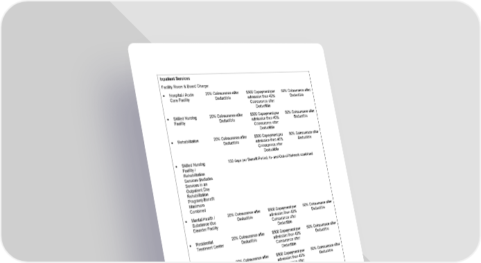 19 Inpatient Services Facility Room & Board Charge: • Hospital / Acute Care Facility 20% Coinsurance after Deductible $500 Copayment per admission then 40% Coinsurance after Deductible 50% Coinsurance after Deductible • Skilled Nursing Facility 20% Coinsurance after Deductible $500 Copayment per admission then 40% Coinsurance after Deductible 50% Coinsurance after Deductible • Rehabilitation 20% Coinsurance after Deductible $500 Copayment per admission then 40% Coinsurance after Deductible 50% Coinsurance after Deductible • Skilled Nursing Facility / Rehabilitation Services (Includes Services in an Outpatient Day Rehabilitation Program) Benefit Maximum Combined 1 5 0 days per Benefit Period, In - and Out - of - Network combined • Mental Health / Substance Use Disorder Facility 20% Coinsurance after Deductible $500 Copayment per admission then 40% Coinsurance after Deductible 50% Coinsurance after Deductible • Residential Treatment Center 20% Coinsurance after Deductible $500 Copayment per admission then 40% Coinsurance after Deductible 50% Coinsurance after Deductible • Ancillary Services 20% Coinsurance after Deductible $500 Copayment per admission then 40% Coinsurance after Deductible 50% Coinsurance after Deductible Hospital Transfers: If you are transferred between Facilities, only one Copayment will apply. You will not have to pay separate Copayments per Facility . Hospital Readmissions: If you are readmitted to the Hospital within 72 hours of your discharge for the same medical diagnosis, you will not have to pay an additional Copayment upon readmission. Doctor Services for : • General Medical Care/Evaluation and Management (E&M) 20% Coinsurance after Deductible 40% Coinsurance after Deductible 50% Coinsurance after Deductible • Surgery 20% Coinsurance after Deductible 40% Coinsurance after Deductible 50% Coinsurance after Deductible
