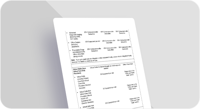 28 • Advanced Diagnostic Imaging (including MRIs, CAT scans) 20% Coinsurance after Deductible 40% Coinsurance after Deductible 50% Coinsurance after Deductible • Office Surgery (including anesthesia) $75 Copayment per visit 40% Coinsurance after Deductible 50% Coinsurance after Deductible • Prescription Drugs Administered in the Office (other than allergy serum) 20% Coinsurance after Deductible 40% Coinsurance after Deductible 50% Coinsurance after Deductible Note: If you get urgent care at a Hospital or other outpatient Facility, please refer to “Outpatient Facility Services” for details on what you will pay. Virtual Visits ( from Virtual Care Only Providers ) Virtual Visits Conducted through our mobile app and website: Other Virtual Visits: • Virtual Visits including Primary Care from Virtual Care - Only Providers (Medical Services) $0 Copayment per visit Please refer to the “Office and Home Visits” section. • Virtual Visits from Virtual Care - Only Provider s (Mental Health and Substance Use Disorder Services) $0 Copayment per visit Please refer to the “Office and Home Visits” section. • Virtual Visits from Virtual Care - Only Providers (Specialty Care Services) $30 Copayment per visit Please refer to the “Office and Home Visits” section. Vision Services (For medical and surgical treatment of injuries and/or diseases of the eye) Certain vision screenings required by Federal law are covered under the "Preventive Care" benefit. Benefits are based on the setting in which Covered Services are received.