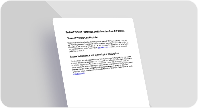 4 Federal Patient Protection and Affordable Care Act Notices Choice of Primary Care Physician We generally allow the designation of a Primary Care Physician (PCP). You have the right to designate any PCP who participates in our network and who is available to accept you or your family members. For information on how to select a PCP, and for a list of PCPs, contact the telephone number on the back of your Identification Card or refer to our website, www.anthem.com . For children, you may designate a pediatrician as the PCP. Access to Obstetrical and Gynecological (ObGyn) Care You do not need prior authorization from us or from any other person (including a PCP) in order to obtain access to obstetrical or gynecological care from a health care professional in our network who specializes in obstetrics or gynecology. The health car e professional, however, may be required to comply with certain procedures, including obtaining prior authorization for certain services or following a pre - approved treatment plan. For a list of participating health care professionals who specialize in obs tetrics or gynecology, contact the telephone number on the back of your Identification Card or refer to our website, www.anthem.com