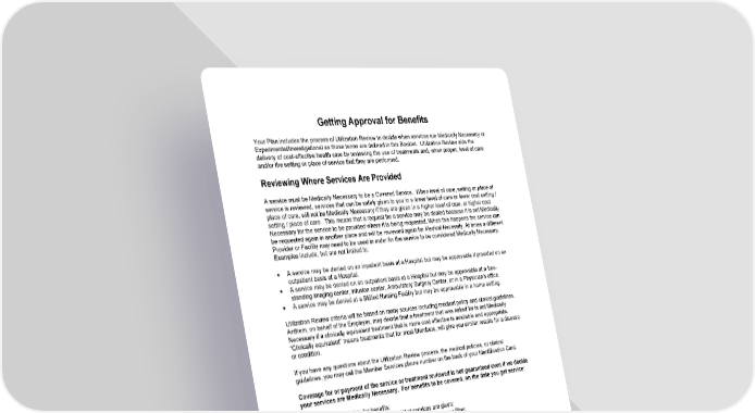 35 Getting Approval for Benefits Your Plan includes the process of Utilization Review to decide when services are Medically Necessary or Experimental/Investigational as those terms are defined in this Booklet . Utilization Review aids the delivery of cost - effective health care by reviewing the use of treatments and, when proper, level of care and/or the setting or place of service that they are performed. Reviewing Where Services Are Provided A service must be Medically Necessary to be a Covered Service. When level of care, setting or place of service is reviewed, services that can be safely given to you in a lower level of care or lower cost setting / place of care, will not be Medically Nece ssary if they are given in a higher level of care, or higher cost setting / place of care. This means that a request for a service may be denied because it is not Medically Necessary for the service to be provided where it is being requested. When this ha ppens the service can be requested again in another place and will be reviewed again for Medical Necessity. At times a different Provider or Facility may need to be used in order for the service to be considered Medically Necessary. Examples include, but are not limited to: • A service may be denied on an inpatient basis at a Hospital but may be approvable if provided on an outpatient basis at a Hospital. • A service may be denied on an outpatient basis at a Hospital but may be approvable at a free - standing imaging center, infusion center, Ambulatory Surgery Center, or in a Physician’s office. • A service may be denied at a Skilled Nursing Facility but may be approvable in a home setting. Utilization Review criteria will be based on many sources including medical policy and clinical guidelines. Anthem, on behalf of the Employer, may decide that a treatment that was asked for is not Medically Necessary if a clinically equivalent treatment that is more cost effective is available and appropriate. “Clinically equivalent” means treatments that for most Members, will give you similar r esults for a disease or condition. If you have any questions about the Utilization Review process, the medical policies, or clinical guidelines, you may call the Member Services phone number on the back of your Identification Card. Coverage for or payment of the service or treatment reviewed is not guaranteed even if we decide your services are Medically Necessary. For benefits to be covered, on the date you get service : 1. You must be eligible for benefits; 2. Fees must be paid for the time period that services are given; 3. The service or supply must be a Covered Service under your Plan; 4. The service cannot be subject to an Exclusion under your Plan; and 5. You must not have exceeded any applicable limits under your Plan. Types of Reviews • Pre - service Review – A review of a service, treatment or admission for a benefit coverage determination, which is done before the service or treatment begins or admission date. - Precertification – A required Pre - service Review for a benefit coverage determination for a service or treatment. Certain services require Precertification in order for you to get benefits. The benefit coverage review will include a review to decide whether the service meets the definition of Medical Necessity or is Experimental / Investigational as those terms are defined in this Booklet. For admissions following Emergency Care, you, your authorized representative or Doctor must tell us of the admission as soon as possible . For childbirth admissions, Precertification is not
