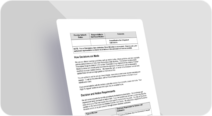 37 Provider Network Status Responsibility to Get Precertification Comments Precertification for all Inpatient Admissions. NOTE: For an Emergency Care admission, Precertification is not required. However, you, your authorized representative or Doctor must tell us of the admission as soon as possible. How Decisions are Made We use our clinical coverage guidelines, such as medical policy, clinical guidelines, and other applicable policies and procedures to help make Medical Necessity decisions. This includes decisions about Prescription Drugs as detailed in the section “Prescription Drugs Administered by a Medical Provider” . Medical policies and clinical guidelines reflect the standard s of practice and medical interventions identified as proper medical practice. We reserve the right , on behalf of the Employer, to review and update these clinical coverage guidelines from time to time. You are entitled to ask for and get, free of charge, reasonable access to any records concerning your request. To ask for this information, call the Precertification phone number on the back of your Identification Card. If you are not satisfied with the decision under this section of your benefits, please refer to the “Your Right To Appeal” section to see what rights may be available to you. Decision and Notice Requirements We will review requests for benefits according to the timeframes listed below. The timeframes and requirements listed are based on federal laws. If you live in and/or get services in a state other than the state where your Plan was issued other state - specific requirements may apply. You may call the phone number on the back of your Identification Card for more details. We will accept a request for Pre - service Reviews sent to us by your provider through secure electronic submission. Type of Review Timeframe Requirement for Decision and Notification Urgent Pre - service Review 72 hours or 2 business days from the receipt of request whichever is less Non - Urgent Pre - service Review 72 hours or 2 business days from the receipt of all necessary information whichever is less Urgent Continued/Concurrent Stay Review when request is received more than 24 hours before the end of the previous authorization 24 hours from the receipt of the request Urgent Continued/Concurrent Stay Review when request is received less than 24 hours before the end of the previous authorization or no previous authorization exists 72 hours from the receipt of the request or 2 business days from the receipt of request whichever is less Non - urgent Continued/Concurrent Stay Review for ongoing outpatient treatment 2 business days from the receipt of request Post - Service Review 2 business days from the receipt of request