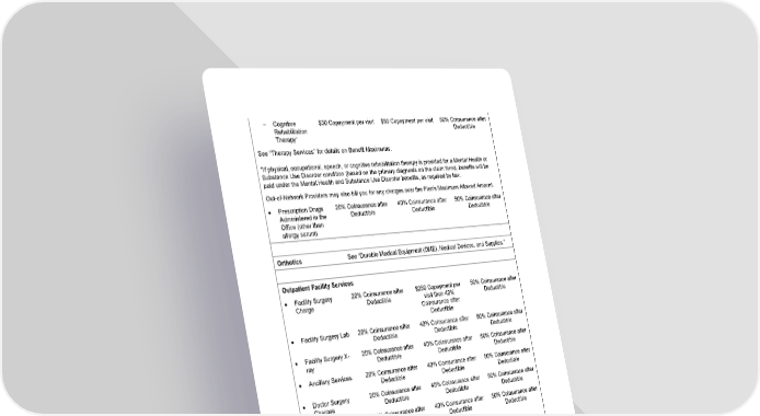 23 - Cognitive Rehabilitation Therapy + $30 Copayment per visit $80 Copayment per visit 50% Coinsurance after Deductible See “Therapy Services” for details on Benefit Maximums. + If physical , occupational , speech , or cognitive rehabilitation therapy is provided for a Mental Health or Substance Use Disorder condition (based on the primary diagnosis on the claim form) , benefits will be paid under the Mental Health and Substance Use Disorder benefits, as required by law . Out - of - Network Providers may also bill you for any charges over the Plan’s Maximum Allowed Amount. • Prescription Drugs Administered in the Office (other than allergy serum) 20% Coinsurance after Deductible 40% Coinsurance after Deductible 50% Coinsurance after Deductible Orthotics See “ Durable Medical Equipment (DME), Medical Devices, and Supplies. ” Outpatient Facility Services • Facility Surgery Charge 20% Coinsurance after Deductible $250 Copayment per visit then 40% Coinsurance after Deductible 50% Coinsurance after Deductible • Facility Surgery Lab 20% Coinsurance after Deductible 40% Coinsurance after Deductible 50% Coinsurance after Deductible • Facility Surgery X - ray 20% Coinsurance after Deductible 40% Coinsurance after Deductible 50% Coinsurance after Deductible • Ancillary Services 20% Coinsurance after Deductible 40% Coinsurance after Deductible 50% Coinsurance after Deductible • Doctor Surgery Charges 20% Coinsurance after Deductible 40% Coinsurance after Deductible 50% Coinsurance after Deductible • Other Doctor Charges (including Anesthesiologist, Pathologist, Radiologist, Surgical Assistant), Nutritional Counseling, and Diabetes Education 20% Coinsurance after Deductible 40% Coinsurance after Deductible 50% Coinsurance after Deductible • Other Facility Charges (for procedure rooms) 20% Coinsurance after Deductible $250 Copayment per visit then 40% Coinsurance after Deductible 50% Coinsurance after Deductible • Mental Health / Substance Use Disorder Services