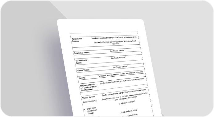 26 Rehabilitation Services Benefits are based on the setting in which Covered Services are received. See “Inpatient Services” and “Therapy Services” for details on Benefit Maximums. Respiratory Therapy See “Therapy Services.” Skilled Nursing Facility See “Inpatient Services.” Speech Therapy See “Therapy Services.” Surgery Benefits are based on the setting in which Covered Services are received. Temporomandibular and Craniomandibular Joint Treatment Benefits are based on the setting in which Covered Services are received. Therapy Services Benefits are based on the setting in which Covered Services are received. Benefit Maximum(s) : Benefit Maximum(s) are for In - and Out - of - Network visits combined, and for office and outpatient visits combined. • Physical and Occupational Therapy 40 visits per Benefit Period • Speech Therapy 20 visits per Benefit Period • Manipulation Therapy 12 visits per Benefit Period • Cardiac Rehabilitation 36 visits per Benefit Period • Pulmonary Rehabilitation 20 visits per Benefit Period The limits for physical, occupational, and speech therapy will not apply if you get care as part of the Mental Health and Substance Use Disorder benefit (based on the primary diagnosis on the claim form). Note: The limits for physical, occupational, and speech therapy will not apply if you get that care as part of the Hospice benefit.