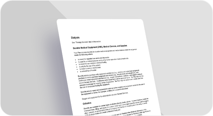 46 Dialysis See “Therapy Services” later in this section. Durable Medical Equipment (DME), Medical Devices, and Supplies Your Plan includes benefits for durable medical equipment and medical devices when the equipment meets the following criteria: • Is meant for repeated use and is not disposable. • Is used for a medical purpose and is of no further use when medical need ends. • Is meant for use outside a medical Facility. • Is only for the use of the patient. • Is made to serve a medical use. • Is ordered by a Provider. Benefits include purchase - only equipment and devices (e.g., crutches and customized equipment), purchase or rent - to - purchase equipment and devices (e.g., Hospital beds and wheelchairs), and continuous rental equipment and devices (e.g., oxygen concentrator , ventilator, and negative pressure wound therapy devices). Continuous rental equipment must be approved by us. The Plan may limit the amount of coverage for ongoing rental of equipment. The Plan may not cover more in rental costs than the cost of simply purchasing the equipment. Benefits include repair and replacement costs as well as supplies and equipment needed for the use of the equipment or device, for example, a battery for a powered wheelchair. Oxygen and equipment for its administration are also Covered Services. Orthotics Benefits are available for certain types of orthotics (braces, boots, splints). Covered Services include the initial purchase, fitting, and repair of a custom made rigid or semi - rigid supportive device used to support, align, prevent, or correct deformities or to improve the function of movable parts of the body, or which limits or st ops motion of a weak or diseased body part. Orthotic appliances may be replaced once per year per Member when Medically Necessary in the Member’s situation. However, additional replacements will be allowed for Members under age 18 due to rapid growth, or for any Member when an appliance is damaged and cannot be repaired. Coverage for an orthotic c ustom fabricated brace or support designed as a component for a prosthetic limb is described in more detail below. Prosthetics Your Plan also includes benefits for prosthetics, which are artificial substitutes for body parts for functional or therapeutic purposes, when they are Medically Necessary for activities of daily living. Benefits include the purchase, fitting, adjustments, repairs and replacements. Covered Services may include, but are not limited to: • Artificial limbs and accessories. Coverage for a prosthetic limb (artificial leg or arm) is described in more detail below.