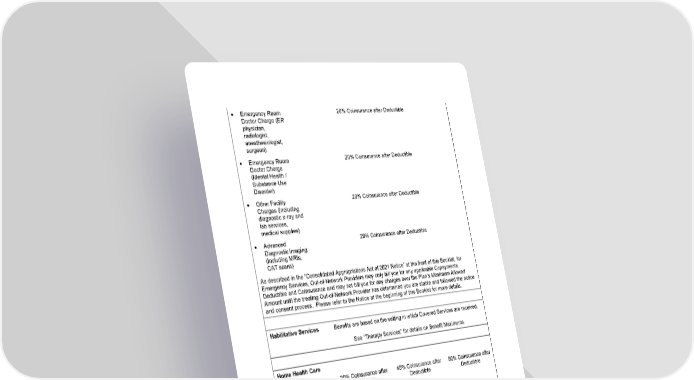 17 • Emergency Room Doctor Charge (ER physician, radiologist, anesthesiologist, surgeon) 20% Coinsurance after Deductible • Emergency Room Doctor Charge (Mental Health / Substance Use Disorder ) 20% Coinsurance after Deductible • Other Facility Charges (including diagnostic x - ray and lab services, medical supplies) 20% Coinsurance after Deductible • Advanced Diagnostic Imaging (including MRIs, CAT scans) 20% Coinsurance after Deductible As described in the “Consolidated Appropriations Act of 2021 Notice” at the front of this Booklet, for Emergency Services, Out - of - Network Providers may only bill you for any applicable Copayments, Deductible and Coinsurance and may not bill you for any charges over the Plan’s Maximum Allowed Amount until the treating Out - of - Network Provider has determined you are stable and followed the notice and consent process . Please refer to the Notice at the beginning of this Booklet for more details. Habilitative Services Benefits are based on the setting in which Covered Services are received. See “Therapy Services” for details on Benefit Maximums. Home Health Care • Home Health Care Visits from a Home Health Care Agency (Including intermittent skilled nursing services) 20% Coinsurance after Deductible 40% Coinsurance after Deductible 50% Coinsurance after Deductible • Home Dialysis 20% Coinsurance after Deductible 40% Coinsurance after Deductible 50% Coinsurance after Deductible • Home Infusion Therapy / Chemotherapy 20% Coinsurance after Deductible 40% Coinsurance after Deductible 50% Coinsurance after Deductible • Specialty Prescription Drugs for Infusion / Injection – Other than Chemotherapy 20% Coinsurance after Deductible 40% Coinsurance after Deductible 50% Coinsurance after Deductible