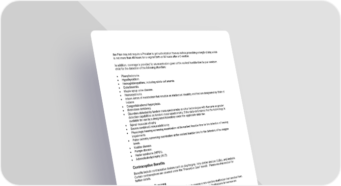 54 the Plan may not require a Provider to get authorization from us before prescribing a length of stay which is not more than 48 hours for a vaginal birth or 96 hours after a C - section. In addition, coverage is provided for an examination given at the earliest feasible time to your newborn child for the detection of the following disorders: • Phenylketonuria. • Hypothyroidism. • Hemoglobinopathies, including sickle cell anemia • Galactosemia. • Maple syrup urine disease. • Homocystinuria. • Inborn errors of metabolism that result in an intellectual disability and that are designated by State of Indiana • Congenital adrenal hyperplasia. • Biotinidase deficiency. • Disorders detected by tandem mass spectrometry or other technologies with the same or greater detection capabilities as tandem mass spectrometry, if the state determines that the technology is available for use by a designated laboratory under the applicable state law. • Spinal muscular atrophy • Severe combined immunodeficiency • Physiologic hearing screening examination at the earliest feasible time for the detection of hearing impairments • Pulse oximetry screening examination at the earliest feasible time for the detection of low oxygen levels. • Krabbe disease. • Pompe disease. • Hurler syndrome (MPS1). • Adrenoleukodystrophy (ALD) Contraceptive Benefits Benefits include contraceptive devices such as diaphragms, intra uterine devices (IUDs), and implants. Certain contraceptives are covered under the “Preventive Care” benefit. Please see that section for further details. Sterilization Services Benefits include sterilization services and services to reverse a non - elective sterilization that resulted from an illness or injury. Reversals of elective sterilizations are not covered. Sterilizations for women are covered under the “ Preventive Care ” benefit. Infertility Services Important Note: Although this Plan offers limited coverage of certain infertility services, it does not cover all forms of infertility treatment. Benefits do not include assisted reproductive technologies (ART) or the diagnostic tests and Drugs to support it. Examples o f ART include artificial insemination, in - vitro fertilization, zygote intrafallopian transfer (ZIFT), or gamete intrafallopian transfer (GIFT). Covered Services include diagnostic tests to find the cause of infertility, such as diagnostic laparoscopy, endometrial biopsy, and semen analysis. Benefits also include services to treat the underlying medical conditions that cause infertility (e.g., end ometriosis, obstructed fallopian tubes, and hormone deficiency). Fertility treatments such as artificial insemination and in - vitro fertilization are not a Covered Service.