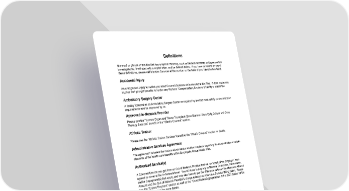 112 Definitions If a word or phrase in this Booklet has a special meaning, such as Medical Necessity or Experimental / Investigational, it will start with a capital letter, and be defined below. If you have questions on any of these definitions, please call Member Servic es at the number on the back of your Identification Card. Accidental Injury An unexpected Injury for which you need Covered Services while enrolled in this Plan. It does not include injuries that you get benefits for under any Workers’ Compensation, Employer’s liability or similar law. Ambulatory Surgery Center A facility licensed as an Ambulatory Surgery Center as required by law that must satisfy our accreditation requirements and be approved by us. Approved In - Network Provider Please see the “ Human Organ and Tissue Transplant (Bone Marrow / Stem Cell), Cellular and Gene Therapy Services” benefit in the “What’s Covered” section. Athletic Trainer Please see the “Athletic Trainer Services” benefit in the “ What’s Covered ” section for details. Administrative Services Agreement The agreement between the Claims Administrator and the Employer regarding the administration of certain elements of the health care benefits of the Employer's Group Health Plan. Authorized Service(s) A Covered Service you get from an Out - of - Network Provider that we, on behalf of the Employer, have agreed to cover at the In - Network level. You will have to pay any In - Network Deductible, Coinsurance, and/or Copayment(s) that apply, and may also have to pay the difference between the Maximum Allowed Amount and the Out - of - Network Provider’s charge unless your claim is a Surprise Billing Claim . Please see the “ Claims Payment ” section as well as the “Consolidated Appropriations Act of 2021 Notice” at the front of this Booklet for more details. Benefit Period The length of time the Plan will cover benefits for Covered Services. For Calendar Year plans, the Benefit Period starts on January 1 st and ends on December 31 st . For Plan Year plans, the Benefit Period starts on your Employer’s effective or renewal date and lasts for 12 months. (See your Employer for details.) The Schedule of Benefits shows if your Plan’s Benefit Period is a Calendar Year or a Plan Year. If y our coverage ends before the end of the year, then your Benefit Period also ends. Benefit Period Maximum The most the Plan will cover for a Covered Service during a Benefit Period. Biomarker A characteristic that is measured and evaluated as an indicator of normal biologic processes, pathogenic processes, or pharmacologic responses to a specific therapeutic intervention, including but not limited to: