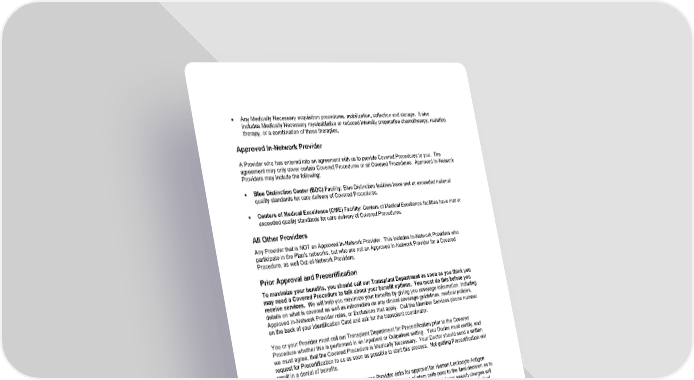51 • Any Medically Necessary acquisition procedures, mobilization, collection and storage. It also includes Medically Necessary myeloablative or reduced intensity preparative chemotherapy, radiation therapy, or a combination of these therapies, Approved In - Network Provider A Provider who has entered into an agreement with us to provide Covered Procedures to you. The agreement may only cover c ertain Covered Procedures or all Covered Procedures. Approved In - Network Providers may include the following: • Blue Distinction Center (BDC) Facility : Blue Distinction facilities have met or exceeded national quality standards for care delivery of Covered Procedures. • Centers of Medical Excellence (CME) Facility: Centers of Medical Excellence facilities have met or exceeded quality standards for care delivery of Covered Procedures. All Other Providers Any Provider that is NOT an Approved In - Network Provider. This includes In - Network Providers who participate in the Plan’s networks, but who are not an Approved In - Network Provider for a Covered Procedure , as well Out - of - Network Providers. Prior Approval and Precertification To maximize your benefits, you should call our Transplant Department as soon as you think you may need a Covered Procedure to talk about your benefit options. You must do this before you receive services. We will help you maximize your benefits by giving you coverage information, including details on what is covered as well as information on any clinical coverage guidelines, medical policies, Approved In - Network Provider rules, or Exclusions that apply. Call the Member Services phone number on the back o f your Identification Card and ask for the transplant coordinator. You or your Provider must call our Transplant Department for Precertification prior to the Covered Procedure whether this is performed in an Inpatient or Outpatient setting. Your Doctor must certify, and we must agree, that the Covered Procedure is Medica lly Necessary. Your Doctor should send a written request for Precertification to us as soon as possible to start this process. Not getting Precertification will result in a denial of benefits. Please note that there are cases where your Provider asks for approval for Human Leukocyte Antigen (HLA) testing, donor searches and/or a collection and storage of stem cells prior to the final decision as to what Covered Procedure will be needed. In thes e cases, the HLA testing and donor search charges will be covered as routine diagnostic tests. The collection and storage request will be reviewed for Medical Necessity and may be approved. However, such an approval for HLA testing, donor search and/or c ollection and storage is NOT an approval for the later Covered Procedure. A separate Medical Necessity decision will be needed for the Covered Procedure. Transportation and Lodging The Plan will cover the cost of reasonable and necessary travel costs when you get prior approval and need to travel more than 75 miles from your permanent home to reach the Facility where the Covered Procedure will be performed. Help with travel costs in cludes transportation to and from the Facility and lodging for the patient and one companion. If the Member receiving care is a minor, then reasonable and necessary costs for transportation and lodging may be allowed for two companions. You must send ite mized receipts for transportation and lodging costs in a form satisfactory to us when claims are filed. Call us for complete information or refer to IRS Publication 502 .