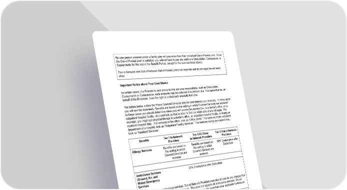 14 No one person covered under a family plan will pay more than their individual Out - of - Pocket Limit. Once th e Out - of - Pocket Limit is satisfied, you will not have to pay any additional Deductibles, Coinsurance, or Copayments for the rest of the Benefit Period , except for the services listed above . The In - Network and Out - of - Network Out - of - Pocket Limits are separate and do not apply toward each other. Important Notice about Your Cost Shares In certain cases, if a Provider is paid amounts that are your responsibility, such as Deductibles, Copayments or Coinsurance, such amounts may be collected directly from you. You agree that we, on behalf of the Employer, have the right to collect such amou nts from you. The tables below outline the Plan’s Covered Services and the cost share(s) you must pay. In many spots you will see the statement, “Benefits are based on the setting in which Covered Services are received.” In these cases you should determine where you will receive the service (i.e., in a doctor’s office, at an outpatient hospital facility, etc.) and look up that location to find out which cos t share will apply. For example, you might get physical therapy in a doctor’s office, an outpatient hospital faci lity, or during an inpatient hospital stay. For services in the office, look up “Office Visits.” For services in the outpatient department of a hospital, look up “Outpatient Facility Services.” For services during an inpatient stay, look up “Inpatient Services.” Benefits Tier 1 In - Network Providers Tier 2 All Other In - Network Providers Tier 3 Out - of - Network Providers Allergy Services Benefits are based on the setting in which Covered Services are received. Benefits are based on the setting in which Covered Services are received. 50% Coinsurance after Deductible Ambulance Services (Ground, Air, and Water) Emergency Services 20% Coinsurance after Deductible For ground or water ambulance services, Out - of - Network Providers may also bill you for any charges that exceed the Plan’s Maximum Allowed Amount. This does not apply to air ambulance services. For air ambulance services, Out - of - Network Providers cannot bill you for more than your applicable In - Network Deductible, Coinsurance, and/or Copayment . Ambulance Services (Ground, Air, and Water) Non - Emergency Services 20% Coinsurance after Deductible For ground or water ambulance services, Out - of - Network Providers may also bill you for any charges that exceed the Plan’s Maximum Allowed Amount. This does not apply to air ambulance services. For air ambulance services, Out - of - Network Providers cannot bill you for more than your applicable In - Network Deductible, Coinsurance, and/or Copayment . Important Note: All scheduled ambulance services for non - Emergency transfers, except transfers from one acute Facility to another, must be approved through precertification. Please see “Getting Approval for Benefits” for details.
