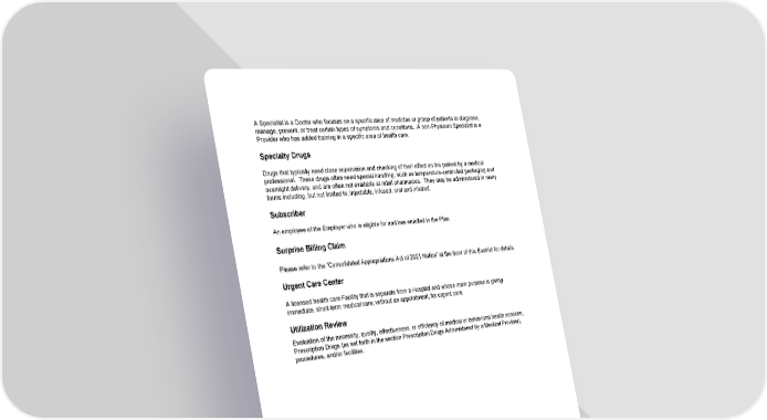 121 A Specialist is a Doctor who focuses on a specific area of medicine or group of patients to diagnose, manage, prevent, or treat certain types of symptoms and conditions. A non - Physician Specialist is a Provider who has added training in a specific area of health care. Specialty Drugs Drugs that typically need close supervision and checking of their effect on the patient by a medical professional. These drugs often need special handling, such as temperature - controlled packaging and overnight delivery, and are often not available at ret ail pharmacies. They may be administered in many forms including, but not limited to, injectable, infused, oral and inhaled. Subscriber An employee of the Employer who is eligible for and has enrolled in the Plan. Surprise Billing Claim Please refer to the “Consolidated Appropriations Act of 2021 Notice” at the front of this Booklet for details. Urgent Care Center A licensed health care Facility that is separate from a Hospital and whose main purpose is giving immediate, short - term medical care, without an appointment, for urgent care. Utilization Review Evaluation of the necessity, quality, effectiveness, or efficiency of medical or behavioral health services, Prescription Drugs (as set forth in the section Prescription Drugs Administered by a Medical Provider), procedures, and/or facilities.