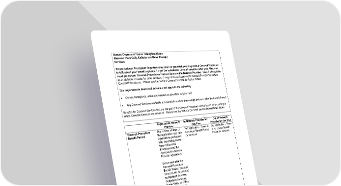29 Human Organ and Tissue Transplant (Bone Marrow / Stem Cell), Cellular and Gene Therapy Services Please call our Transplant Department as soon as you think you may need a Covered Procedure to talk about your benefit options. To get the In - Network Level of benefits under your Plan, you must get certain Covered Procedures from an Approved In - Network Provider. Even if a Hospital is an In - Network Provider for other services, it may not be an Approved In - Network Provider for certain Covered Procedures. Please see the “What’s Covered” section for further details. The requirements described below do not apply to the following: • Cornea transplants, which are covered as any other surgery; and • Any Covered Services related to a Covered Procedure that you get before or after the Benefit Period. Benefits for Covered Services that are not part of the Covered Procedure will be based on the setting in which Covered Services are received. Please see the “What’s Covered” section for additional details. Approved In - Network Provider In - Network Provider for this Plan Out - of - Network Provider for this Plan Covered Procedure Benefit Period The number of days or the applicable case rate / global time period will vary depending on the type of Covered Procedure and the Approved In - Network Provider agreement. Before and after the Covered Procedure Benefit Period, Covered Services will be covered as Inpatient Services, Outpatient Services, Home Visits, or Office Visits depending on where the service is performed. Not applicable – There is no unique Benefit Period for services Not applicable – There is no unique Benefit Period for services Inpatient Facility Services • Precertification required No Copayment, Deductible, or Coinsurance No Copayment, Deductible, or Coinsurance 50% Coinsurance after Deductible . These charges will NOT apply to your Out - of - Pocket Limit. Inpatient Professional and Ancillary (non - Hospital) Services No Copayment, Deductible, or Coinsurance No Copayment, Deductible, or Coinsurance 50% Coinsurance after Deductible . These charges will NOT apply to your Out - of - Pocket Limit.
