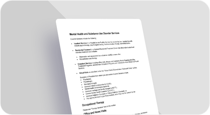 55 Mental Health and Substance Use Disorder Services Covered Services include the following: • Inpatient Services in a Hospital or any Facility that must be covered by law. Inpatient benefits include psychotherapy, psychological testing, electroconvulsive therapy, and detoxification. • Residential Treatment in a licensed Residential Treatment Center that offers individualized and intensive treatment and includes: • Observation and assessment by a physician weekly or more often, • Rehabilitation and therapy. • Outpatient Services including office visits, therapy and treatment, Partial Hospitalization/Day Treatment Programs, and Intensive Outpatient Programs and Intensive In - Home Behavioral Health Services. • Virtual Visits as described under the “Virtual Visits (Telemedicine / Telehealth Visits)” section. Examples of Providers from whom you can receive Covered Services include: • Psychiatrist, • Psychologist, • Neuropsychologist, • Licensed clinical social worker (L.C.S.W.), • Mental health clinical nurse specialist, • Licensed marriage and family therapist (L.M.F.T.), • License Mental Health Counselor (L.M.H.C.), • Licensed Addiction Counselor or Clinical Addiction Counselor, or • Any agency licensed to give these services, when they must be covered by law . Occupational Therapy Please see “Therapy Services” later in this section. Office and Home Visits Covered Services include: Office Visits for medical care (including second surgical opinions) to examine, diagnose, and treat an illness or injury. Home Visits for medical care to examine, diagnose, and treat an illness or injury. Please note that Doctor and Primary Care Provider visits in the home are different than the “Home Health Care Services” benefit described earlier in this Booklet. Consultations between your Primary Care Physician and a Specialist, when approved by the Plan. Retail Health Clinic Care for limited basic health care services to Members on a “walk - in” basis. These clinics are normally found in major pharmacies or retail stores. Health care services are typically given by Physician’s Assistants or Nurse Practitioners. Services are limite d to routine care and treatment of common illnesses for adults and children.