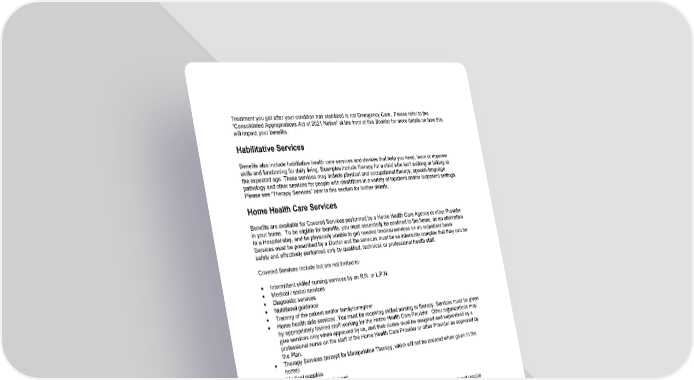 49 Treatment you get after your condition has stabilized is not Emergency Care. Please refer to the “Consolidated Appropriations Act of 2021 Notice” at the front of this Booklet for more details on how this will impact your benefits. Habilitative Services Benefits also include habilitative health care services and devices that help you keep, learn or improve skills and functioning for daily living. Examples include therapy for a child who isn’t walking or talking at the expected age. These services may incl ude physical and occupational therapy, speech - language pathology and other services for people with disabilities in a variety of inpatient and/or outpatient settings. Please see “Therapy Services” later in this section for further details. Home Health Care Services Benefits are available for Covered Services performed by a Home Health Care Agency or other Provider in your home. To be eligible for benefits, you must essentially be confined to the home, as an alternative to a Hospital stay, and be physically unable to get needed medical services on an outpatient basis. Services must be prescribed by a Doctor and the services must be so inherently complex that they can be safely and effectively performed only by qualified, technical, or professional health staff. Covered Services include but are not limited to: • Intermittent skilled nursing services by an R.N. or L.P.N. • Medical / social services • Diagnostic services • Nutritional guidance • Training of the patient and/or family/caregiver • Home health aide services. You must be receiving skilled nursing or therapy. Services must be given by appropriately trained staff working for the Home Health Care Provider. Other organizations may give services only when approved by us, and their duties must be assigned and supervised by a professional nurse on the staff of the Home Health Care Provider or other Provider as approved by the Plan. • Therapy Services (except for Manipulation Therapy, which will not be covered when given in the home) • Medical supplies • Durable medical equipment • Private duty nursing services Benefits are also available for Intensive In - home Behavioral Health Services. These do not require confinement to the home. These services are described in the “Mental Health and Substance Use Disorder Services” section below. Benefits may also be available for Inpatient Services in your home. These benefits are separate from the Home Health Care Services benefit, and are described in the “Inpatient Services” section below. Home Infusion Therapy Please see “Therapy Services” later in this section. Hospice Care