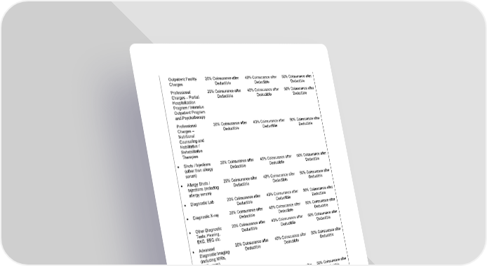 24 Outpatient Facility Charges 20% Coinsurance after Deductible 40% Coinsurance after Deductible 50% Coinsurance after Deductible Professional Charges – Partial Hospitalization Program / Intensive Outpatient Program and Psychotherapy 20% Coinsurance after Deductible 40% Coinsurance after Deductible 50% Coinsurance after Deductible Professional Charges – Nutritional Counseling and Habilitative / Rehabilitative Therapies 20% Coinsurance after Deductible 40% Coinsurance after Deductible 50% Coinsurance after Deductible • Shots / Injections (other than allergy serum) 20% Coinsurance after Deductible 40% Coinsurance after Deductible 50% Coinsurance after Deductible • Allergy Shots / Injections (including allergy serum) 20% Coinsurance after Deductible 40% Coinsurance after Deductible 50% Coinsurance after Deductible • Diagnostic Lab 20% Coinsurance after Deductible 40% Coinsurance after Deductible 50% Coinsurance after Deductible • Diagnostic X - ray 20% Coinsurance after Deductible 40% Coinsurance after Deductible 50% Coinsurance after Deductible • Other Diagnostic Tests: Hearing, EKG, EEG etc. 20% Coinsurance after Deductible 40% Coinsurance after Deductible 50% Coinsurance after Deductible • Advanced Diagnostic Imaging (including MRIs, CAT scans) 20% Coinsurance after Deductible 40% Coinsurance after Deductible 50% Coinsurance after Deductible • Therapy: - Chiropractic / Osteopathic / Manipulative Therapy 20% Coinsurance after Deductible 40% Coinsurance after Deductible 50% Coinsurance after Deductible - Physical Therapy + 20% Coinsurance after Deductible 40% Coinsurance after Deductible 50% Coinsurance after Deductible - Speech Therapy + 20% Coinsurance after Deductible 40% Coinsurance after Deductible 50% Coinsurance after Deductible - Occupational Therapy + 20% Coinsurance after Deductible 40% Coinsurance after Deductible 50% Coinsurance after Deductible - Radiation / Chemotherapy / 20% Coinsurance after Deductible 40% Coinsurance after Deductible 50% Coinsurance after Deductible