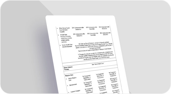 18 • Other Home Health Care Services / Supplies 20% Coinsurance after Deductible 40% Coinsurance after Deductible 50% Coinsurance after Deductible • Private Duty Nursing (Including continuous complex skilled nursing services) 20% Coinsurance after Deductible 40% Coinsurance after Deductible 50% Coinsurance after Deductible • Home Health Care Benefit Maximum 120 visits per Benefit Period , In - and Out - of - Network combined The limit includes Private Duty Nursing and Therapy Services * (e.g., physical, speech, occupational, cardiac and pulmonary rehabilitation) given as part of the Home Care benefit. The limit does not apply to Home Infusion Therapy or Home Dialysis. * If Therapy Services are provided for a Mental Health or Substance Use Disorder condition (based on the primary diagnosis on the claim form) , benefits will be paid under the Mental Health and Substance Use Disorder benefits and the Home Health Care limit will not apply. Home Infusion Therapy See “Home Health Care.” Hospice Care • Home Hospice Care No Copayment, Deductible, or Coinsurance No Copayment, Deductible, or Coinsurance No Copayment, Deductible, or Coinsurance • Bereavement No Copayment, Deductible, or Coinsurance No Copayment, Deductible, or Coinsurance No Copayment, Deductible, or Coinsurance • Inpatient Hospice No Copayment, Deductible, or Coinsurance No Copayment, Deductible, or Coinsurance No Copayment, Deductible, or Coinsurance • Outpatient Hospice No Copayment, Deductible, or Coinsurance No Copayment, Deductible, or Coinsurance No Copayment, Deductible, or Coinsurance • Respite Care No Copayment, Deductible, or Coinsurance No Copayment, Deductible, or Coinsurance No Copayment, Deductible, or Coinsurance Human Organ and Tissue Transplant (Bone Marrow / Stem Cell) Services Please see the separate summary later in this section.