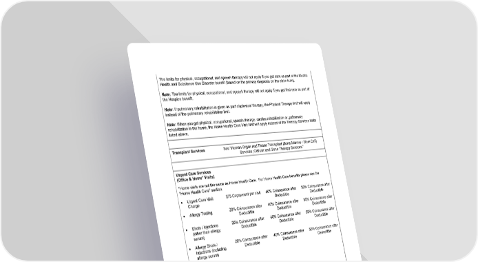 29 The limits for physical, occupational, and speech therapy will not apply if you get care as part of the Mental Health and Substance Use Disorder benefit (based on the primary diagnosis on the claim form). Note: The limits for physical, occupational, and speech therapy will not apply if you get that care as part of the Hospice benefit. Note: If pulmonary rehabilitation is given as part of physical therapy, the Physical Therapy limit will apply instead of the pulmonary rehabilitation limit. Note: When you get physical, occupational, speech therapy, cardiac rehabilitation or, pulmonary rehabilitation in the home, the Home Health Care Visit limit will apply instead of the Therapy Services limits listed above. Transplant Services See “Human Organ and Tissue Transplant (Bone Marrow / Stem Cell) Services, Cellular and Gene Therapy Services.” Urgent Care Services (Office & Home* Visits) *Home visits are not the same as Home Health Care. For Home Health Care benefits please see the "Home Health Care" section. • Urgent Care Visit Charge $75 Copayment per visit 40% Coinsurance after Deductible 50% Coinsurance after Deductible • Allergy Testing 20% Coinsurance after Deductible 40% Coinsurance after Deductible 50% Coinsurance after Deductible • Shots / Injections (other than allergy serum) 20% Coinsurance after Deductible 40% Coinsurance after Deductible 50% Coinsurance after Deductible • Allergy Shots / Injections (including allergy serum) A $10 Copayment for allergy injection(s) will be applied when the injection(s) is billed by itself. The PCP or SCP office visit Copayment/Coinsuran ce will apply if an office visit is billed with an allergy injection. 20% Coinsurance after Deductible 40% Coinsurance after Deductible 50% Coinsurance after Deductible • Diagnostic Lab (i.e., other than reference labs) No Copayment, Deductible, or Coinsurance No Copayment, Deductible, or Coinsurance 50% Coinsurance after Deductible • Diagnostic x-ray No Copayment, Deductible, or Coinsurance No Copayment, Deductible, or Coinsurance 50% Coinsurance after Deductible