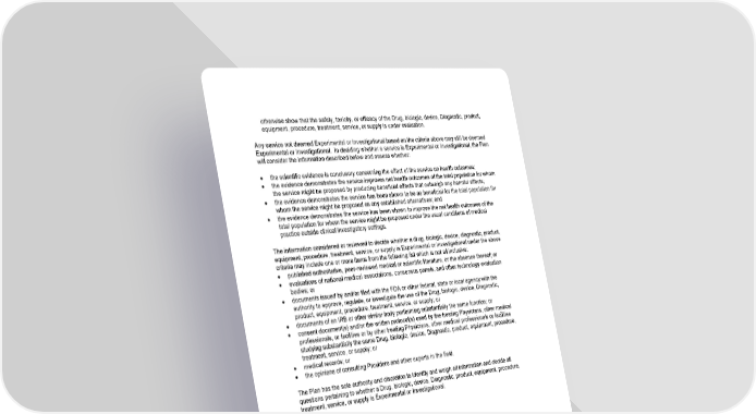 117 otherwise show that the safety, toxicity, or efficacy of the Drug, biologic, device, Diagnostic, product, equipment, procedure, treatment, service, or supply is under evaluation. Any service not deemed Experimental or Investigational based on the criteria above may still be deemed Experimental or Investigational. In deciding whether a service is Experimental or Investigational, the Plan will consider the information described below and assess whether: • the scientific evidence is conclusory concerning the effect of the service on health outcomes; • the evidence demonstrates the service improves net health outcomes of the total population for whom the service might be proposed by producing beneficial effects that outweigh any harmful effects; • the evidence demonstrates the service has been shown to be as beneficial for the total population for whom the service might be proposed as any established alternatives; and • the evidence demonstrates the service has been shown to improve the net health outcomes of the total population for whom the service might be proposed under the usual conditions of medical practice outside clinical investigatory settings. The information considered or reviewed to decide whether a drug, biologic, device, diagnostic, product, equipment, procedure, treatment, service, or supply is Experimental or Investigational under the above criteria may include one or more items from the following list which is not all inclusive: • published authoritative, peer-reviewed medical or scientific literature, or the absence thereof; or • evaluations of national medical associations, consensus panels, and other technology evaluation bodies; or • documents issued by and/or filed with the FDA or other federal, state or local agency with the authority to approve, regulate, or investigate the use of the Drug, biologic, device, Diagnostic, product, equipment, procedure, treatment, service, or supply; or • documents of an IRB or other similar body performing substantially the same function; or • consent document(s) and/or the written protocol(s) used by the treating Physicians, other medical professionals, or facilities or by other treating Physicians, other medical professionals or facilities studying substantially the same Drug, biologic, device, Diagnostic, product, equipment, procedure, treatment, service, or supply; or • medical records; or • the opinions of consulting Providers and other experts in the field. The Plan has the sole authority and discretion to identify and weigh all information and decide all questions pertaining to whether a Drug, biologic, device, Diagnostic, product, equipment, procedure, treatment, service, or supply is Experimental or Investigational.