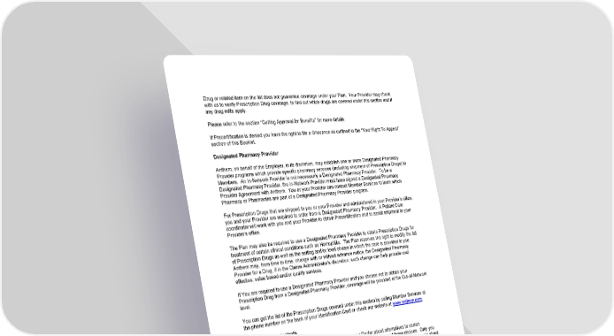 67 Drug or related item on the list does not guarantee coverage under your Plan. Your Provider may check with us to verify Prescription Drug coverage, to find out which drugs are covered under this section and if any drug edits apply. Please refer to the section “Getting Approval for Benefits” for more details. If Precertification is denied you have the right to file a Grievance as outlined in the “Your Right To Appeal” section of this Booklet. Designated Pharmacy Provider Anthem, on behalf of the Employer, in its discretion, may establish one or more Designated Pharmacy Provider programs which provide specific pharmacy services (including shipment of Prescription Drugs) to Members. An In-Network Provider is not necessarily a Designated Pharmacy Provider. To be a Designated Pharmacy Provider, the In-Network Provider must have signed a Designated Pharmacy Provider Agreement with Anthem. You or your Provider can contact Member Services to learn which Pharmacy or Pharmacies are part of a Designated Pharmacy Provider program. For Prescription Drugs that are shipped to you or your Provider and administered in your Provider’s office, you and your Provider are required to order from a Designated Pharmacy Provider. A Patient Care coordinator will work with you and your Provider to obtain Precertification and to assist shipment to your Provider’s office. The Plan may also be required to use a Designated Pharmacy Provider to obtain Prescription Drugs for treatment of certain clinical conditions such as Hemophilia. The Plan reserves the right to modify the list of Prescription Drugs as well as the setting and/or level of care in which the care is provided to you. Anthem may, from time to time, change with or without advance notice, the Designated Pharmacy Provider for a Drug, if in the Claims Administrator’s discretion, such change can help provide cost effective, value based and/or quality services. If You are required to use a Designated Pharmacy Provider and you choose not to obtain your Prescription Drug from a Designated Pharmacy Provider, coverage will be provided at the Out-of-Network level. You can get the list of the Prescription Drugs covered under this section by calling Member Services at the phone number on the back of your Identification Card or check our website at www.anthem.com. Therapeutic Equivalents Therapeutic equivalents is a program that tells you and your Doctor about alternatives to certain prescribed Drugs. We may contact you and your Doctor to make you aware of these choices. Only you and your Doctor can determine if the therapeutic equivalent is right for you. For questions or issues about therapeutic Drug equivalents call Member Services at the phone number on the back of your Identification Card.