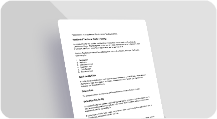 127 Please see the “Subrogation and Reimbursement” section for details. Residential Treatment Center / Facility: An Inpatient Facility that provides multidisciplinary treatment for Mental Health and Substance Use Disorder conditions. The Facility must be licensed as a residential treatment center in the state in which it is located, satisfy our accreditation requirements, and be approved by us The term Residential Treatment Center/Facility does not include a Provider, or that part of a Provider, used mainly for: 1. Nursing care 2. Rest care 3. Convalescent care 4. Care of the aged 5. Custodial Care 6. Educational care Retail Health Clinic A Facility that gives limited basic health care services to Members on a “walk-in” basis. These clinics are often found in major pharmacies or retail stores. Medical services are typically given by Physician Assistants and Nurse Practitioners. Service Area The geographical area where you can get Covered Services from an In-Network Provider. Skilled Nursing Facility An Inpatient Facility that provides multidisciplinary treatment for convalescent and rehabilitative care. It must be licensed as a skilled nursing facility in the state in which it is located, satisfy our accreditation requirements, and be approved by us. A Skilled Nursing Facility is not a place mainly for care of the aged, Custodial Care or domiciliary care, or a place for rest, educational, or similar services. Special Enrollment A period of time in which eligible people or their dependents can enroll after the initial enrollment, typically due to an event such as marriage, birth, adoption, etc. See the “Eligibility and Enrollment – Adding Members” section for more details. Specialist (Specialty Care Physician \ Provider or SCP) A Specialist is a Doctor who focuses on a specific area of medicine or group of patients to diagnose, manage, prevent, or treat certain types of symptoms and conditions. A non-Physician Specialist is a Provider who has added training in a specific area of health care. Specialty Drugs Drugs that typically need close supervision and checking of their effect on the patient by a medical professional. These drugs often need special handling, such as temperature-controlled packaging and overnight delivery, and are often not available at retail pharmacies. They may be administered in many forms including, but not limited to, injectable, infused, oral and inhaled.