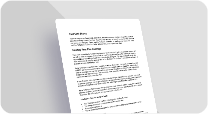 37 Your Cost-Shares Your Plan may involve Copayments, Deductibles, and/or Coinsurance, which are charges that you must pay when receiving Covered Services. Your Plan may also have an Out-of-Pocket Limit, which limits the cost shares you must pay. Please read the “Schedule of Benefits” for details on your cost shares. Also read the “Definitions” section for a better understanding of each type of cost share. Crediting Prior Plan Coverage If you were covered by the Employer’s prior carrier / plan immediately before the Employer signs up with us, with no break in coverage, then you will get credit for any accrued Deductible and, if applicable and approved by us, Out-of-Pocket Limit amounts under that other plan. This does not apply to people who were not covered by the prior carrier or plan on the day before the Employer’s coverage with us began, or to people who join the Employer later. If your Employer moves from one of our plans to another, (for example, changes its coverage from HMO to PPO), and you were covered by the other product immediately before enrolling in this product with no break in coverage, then you may get credit for any accrued Deductible and Out-of-Pocket Limit amounts, if applicable and approved by us. Any maximums, when applicable, will be carried over and charged against the maximums under this Plan. If your Employer offers more than one of our products, and you change from one product to another with no break in coverage, you will get credit for any accrued Deductible and, if applicable, Out-of-Pocket Limit amounts and any maximums will be carried over and charged against maximums under this Plan. If your Employer offers coverage through other products or carriers in addition to ours, and you change products or carriers to enroll in this product with no break in coverage, you will get credit for any accrued Deductible, Out-of-Pocket Limit, and any maximums under this Plan. This Section Does Not Apply To You If: • Your Employer moves to this Plan at the beginning of a Benefit Period; • You change from one of our individual policies to a group plan; • You change employers; or • You are a new Member who joins the Employer after the Employer's initial enrollment with us. The BlueCard Program Like all Blue Cross & Blue Shield plans throughout the country, we participate in a program called "BlueCard" which provides services to you when you are outside our Service Area. For more details on this program, please see “Inter-Plan Arrangements” in the “Claims Payment” section. Identification Card We will give an Identification Card to each Member enrolled in the Plan. When you get care, you must show your Identification Card. Only covered Members have the right to services or benefits under this Booklet. If anyone gets services or benefits to which they are not entitled to under the terms of this Booklet, he/she must pay for the actual cost of the services.