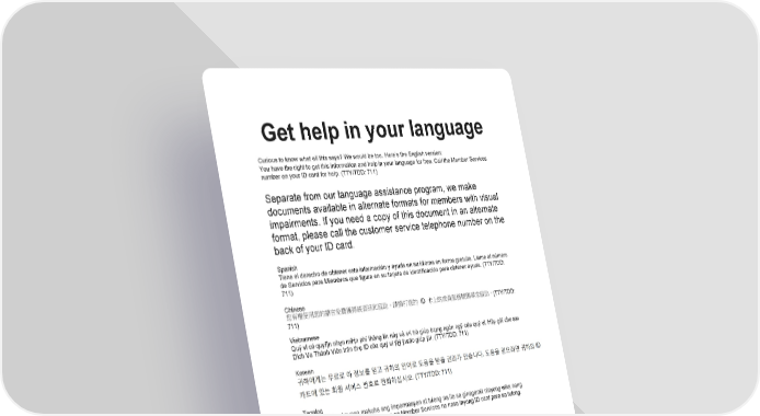 05178WPMENMUB 06/16 General #AG-GEN-001# Get help in your language Curious to know what all this says? We would be too. Here’s the English version: You have the right to get this information and help in your language for free. Call the Member Services number on your ID card for help. (TTY/TDD: 711) Separate from our language assistance program, we make documents available in alternate formats for members with visual impairments. If you need a copy of this document in an alternate format, please call the customer service telephone number on the back of your ID card. Spanish Tiene el derecho de obtener esta información y ayuda en su idioma en forma gratuita. Llame al número de Servicios para Miembros que figura en su tarjeta de identificación para obtener ayuda. (TTY/TDD: 711) Chinese (TTY/TDD: 711) Vietnamese Quý vӏ có quyӅn nhұn miӉn phí thông tin này và sӵ trӧ giúp bҵng ngôn ngӳ cӫa quý vӏ. Hãy gӑi cho sӕ Dӏch Vө Thành Viên trên thҿ ID cӫa quý vӏ ÿӇ ÿѭӧc giúp ÿӥ. (TTY/TDD: 711) Korean Tagalog May karapatan kayong makuha ang impormasyon at tulong na ito sa ginagamit ninyong wika nang walang bayad. Tumawag sa numero ng Member Services na nasa inyong ID card para sa tulong. (TTY/TDD: 711) Russian Arabic Armenian