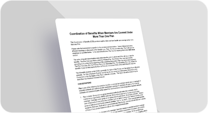 84 Coordination of Benefits When Members Are Covered Under More Than One Plan This Coordination of Benefits (COB) provision applies when you have health care coverage under more than one Plan. Please note that several terms specific to this provision are listed below. Some of these terms have different meanings in other parts of the Booklet, e.g., Plan. For this provision only, "Plan” will have the meanings as specified below. In the rest of the Booklet, Plan has the meaning listed in the Definitions section. The order of benefit determination rules determine the order in which each Plan will pay a claim for benefits. The Plan that pays first is called the Primary Plan. The Primary Plan must pay benefits according to its policy terms regardless of the possibility that another Plan may cover some expenses. The Plan that pays after the Primary Plan is the Secondary Plan. The Secondary Plan may reduce the benefits it pays so that payments from all Plans do not exceed 100% of the total Allowable expense. The Allowable expense under COB is generally the higher of the Primary and Secondary Plans’ allowable amounts. An Out-of-Network Provider can bill you for any remaining Coinsurance, Deductible and/or Copayment under the higher of the Plans’ allowable amounts. This higher allowable amount may be more than Our Maximum Allowed Amount. COB DEFINITIONS Plan is any of the following that provides benefits or services for medical or dental care or treatment. If separate contracts are used to provide coordinated coverage for members of a group, the separate contracts are considered parts of the same Plan and there is no COB among those separate contracts. 1. Plan includes: Group and non-group insurance contracts and subscriber contracts; Health maintenance organization (HMO) contracts; Uninsured arrangements of group or group-type coverage; Coverage under group or non-group closed panel plans; Group-type contracts; Medical care components of long term care contracts, such as skilled nursing care; medical benefits under group or individual automobile contracts (whether “fault” or “no fault”); Other governmental benefits, except for Medicare, Medicaid or a government plan that, by law, provides benefits that are in excess of those of any private insurance plan or other nongovernmental plan. 2. Plan does not include: Accident only coverage; Specified disease or specified accident coverage; Limited health benefit coverage; Benefits for non-medical components of long-term care policies; Hospital indemnity coverage benefits or other fixed indemnity coverage; School accident-type coverages covering grammar, high school, and college students for accidents only, including athletic injuries, either on a twenty-four (24) hour or "to and from school" basis; and Medicare supplement policies. Each contract for coverage under items 1. or 2. above is a separate Plan. If a Plan has two parts and COB rules apply only to one of the two, each of the parts is treated as a separate Plan. This Plan means the part of the contract providing health care benefits that the COB provision applies to and which may be reduced because of the benefits of other plans. Any other part of the contract providing health care benefits is separate from This Plan. A contract may apply one COB provision to certain benefits, such as dental benefits, coordinating only with similar benefits, and may apply another COB provision to coordinate other benefits. The order of benefit determination rules determine whether This Plan is a Primary Plan or Secondary Plan when you have health care coverage under more than one Plan.