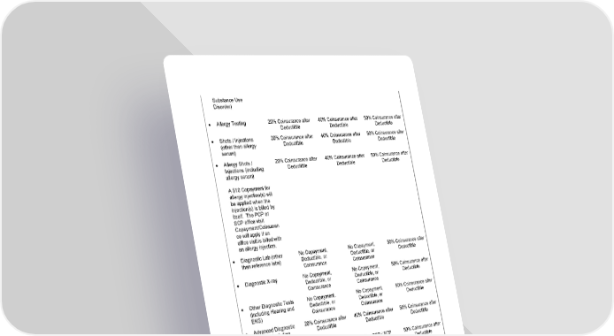24 Substance Use Disorder) • Allergy Testing 20% Coinsurance after Deductible 40% Coinsurance after Deductible 50% Coinsurance after Deductible • Shots / Injections (other than allergy serum) 20% Coinsurance after Deductible 40% Coinsurance after Deductible 50% Coinsurance after Deductible • Allergy Shots / Injections (including allergy serum) A $10 Copayment for allergy injection(s) will be applied when the injection(s) is billed by itself. The PCP or SCP office visit Copayment/Coinsuran ce will apply if an office visit is billed with an allergy injection. 20% Coinsurance after Deductible 40% Coinsurance after Deductible 50% Coinsurance after Deductible • Diagnostic Lab (other than reference labs) No Copayment, Deductible, or Coinsurance No Copayment, Deductible, or Coinsurance 50% Coinsurance after Deductible • Diagnostic X-ray No Copayment, Deductible, or Coinsurance No Copayment, Deductible, or Coinsurance 50% Coinsurance after Deductible • Other Diagnostic Tests (including Hearing and EKG) No Copayment, Deductible, or Coinsurance No Copayment, Deductible, or Coinsurance 50% Coinsurance after Deductible • Advanced Diagnostic Imaging (including MRIs, CAT scans) 20% Coinsurance after Deductible 40% Coinsurance after Deductible 50% Coinsurance after Deductible • Office Surgery (including anesthesia) See PCP / SCP Copayment See PCP / SCP Copayment 50% Coinsurance after Deductible • Therapy Services: - Chiropractic / Osteopathic / Manipulative Therapy $30 Copayment per visit $80 Copayment per visit 50% Coinsurance after Deductible - Physical Therapy+ $30 Copayment per visit $80 Copayment per visit 50% Coinsurance after Deductible - Speech Therapy+ $30 Copayment per visit $80 Copayment per visit 50% Coinsurance after Deductible - Occupational Therapy+ $30 Copayment per visit $80 Copayment per visit 50% Coinsurance after Deductible