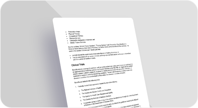 46 • Prescription drugs; • Physical Therapy; • Occupational Therapy; • Chiropractic care; • Osteopathic manipulative treatment; and • Athletic Trainer Services. See the sections “Athletic Trainer Services”, “Therapy Services” and “Prescription Drug Benefits at a Retail or Home Delivery (Mail Order) Pharmacy” for further details on the benefits for these services. As used in this section “Chronic pain" means pain that: • persists beyond the usual course of an acute disease or healing of an injury; or • may be associated with an acute or chronic pathologic process that causes continuous or intermittent pain for a period of months or years. Clinical Trials Benefits include coverage for services, such as routine patient care costs, given to you as a participant in an approved clinical trial if the services are Covered Services under this Plan. An “approved clinical trial” means a phase I, phase II, phase III, or phase IV clinical trial that studies the prevention, detection, or treatment of cancer or other life-threatening conditions. The term life-threatening condition means any disease or condition from which death is likely unless the disease or condition is treated. Benefits are limited to the following trials: 1. Federally funded trials approved or funded by one of the following: a. The National Institutes of Health. b. The Centers for Disease Control and Prevention. c. The Agency for Health Care Research and Quality. d. The Centers for Medicare & Medicaid Services. e. Cooperative group or center of any of the entities described in (a) through (d) or the Department of Defense or the Department of Veterans Affairs. f. A qualified non-governmental research entity identified in the guidelines issued by the National Institutes of Health for center support grants. g. Any of the following in i-iii below if the study or investigation has been reviewed and approved through a system of peer review that the Secretary of Health and Human Services determines 1) to be comparable to the system of peer review of studies and investigations used by the National Institutes of Health, and 2) assures unbiased review of the highest scientific standards by qualified individuals who have no interest in the outcome of the review. i. The Department of Veterans Affairs. ii. The Department of Defense. iii. The Department of Energy. 2. Studies or investigations done as part of an investigational new drug application reviewed by the Food and Drug Administration; 3. Studies or investigations done for drug trials, which are exempt from the investigational new drug application.