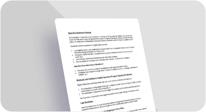 99 Special Enrollment Periods If a Subscriber or Dependent does not apply for coverage when they were first eligible, they may be able to join the Plan prior to Open Enrollment if they qualify for Special Enrollment. Except as noted otherwise below, the Subscriber or Dependent must request Special Enrollment within 31 days of a qualifying event. Special Enrollment is available for eligible individuals who: • Lost eligibility under a prior health plan for reasons other than non-payment of fees or due to fraud or intentional misrepresentation of a material fact; • Exhausted COBRA benefits or stopped receiving group contributions toward the cost of the prior health plan; • Lost employer contributions towards the cost of the other coverage; • Are now eligible for coverage due to marriage, birth, adoption, or placement for adoption. Important Notes about Special Enrollment: • Members who enroll during Special Enrollment are not considered Late Enrollees. • Individuals must request coverage within 31 days of a qualifying event (i.e., marriage, exhaustion of COBRA, etc.). Medicaid and Children’s Health Insurance Program Special Enrollment Eligible Subscribers and Dependents may also enroll under two additional circumstances: • The Subscriber’s or Dependent’s Medicaid or Children’s Health Insurance Program (CHIP) coverage is terminated as a result of loss of eligibility; or • The Subscriber or Dependent becomes eligible for a subsidy (state premium assistance program). The Subscriber or Dependent must request Special Enrollment within 60 days of the above events. Late Enrollees If the Subscriber does not enroll themselves and/or their Dependents when first eligible or during a Special Enrollment period, will not be eligible to enroll until the next Open Enrollment Period. Members Covered Under the Employer’s Prior Plan Members who were previously enrolled under another plan offered by the Employer that is being replaced by this Plan are eligible for coverage on the Effective Date of this coverage. Enrolling Dependent Children Newborn Children Newborn children are covered automatically from the moment of birth for a period of 31 days. To continue coverage beyond the 31 day period you should submit an application / change form to the Employer, within 31 days following the birth, to add the newborn to your Plan. Even if no additional Fees are required, you should still submit an application / change form to the Employer to add the newborn to your Plan, to make sure we have accurate records and are able to cover your claims.