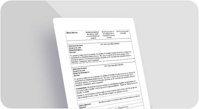 17 Allergy Services Benefits are based on the setting in which Covered Services are received. Benefits are based on the setting in which Covered Services are received. 50% Coinsurance after Deductible Ambulance Services (Ground, Air, and Water) Emergency Services 20% Coinsurance after Deductible For ground or water ambulance services, Out-of-Network Providers may also bill you for any charges that exceed the Plan’s Maximum Allowed Amount. This does not apply to air ambulance services. For air ambulance services, Out-of-Network Providers cannot bill you for more than your applicable In-Network Deductible, Coinsurance, and/or Copayment. Ambulance Services (Ground, Air, and Water) Non-Emergency Services 20% Coinsurance after Deductible For ground or water ambulance services, Out-of-Network Providers may also bill you for any charges that exceed the Plan’s Maximum Allowed Amount. This does not apply to air ambulance services. For air ambulance services, Out-of-Network Providers cannot bill you for more than your applicable In-Network Deductible, Coinsurance, and/or Copayment. Important Note: All scheduled ambulance services for non-Emergency transfers, except transfers from one acute Facility to another, must be approved through precertification. Please see “Getting Approval for Benefits” for details. Benefits for non-Emergency ground or water ambulance services will be limited to $50,000 per trip if an Out-of-Network Provider is used. This limit does not apply to air ambulance services. Autism Spectrum Disorders Benefits are based on the setting in which Covered Services are received. Cardiac Rehabilitation See “Therapy Services.” Cellular and Gene Therapy Services Precertification required See the “Human Organ and Tissue Transplant (Bone Marrow / Stem Cell), Cellular and Gene Therapy Services” section later in this Schedule. Chemotherapy See “Therapy Services.” Chronic Pain Management Services Benefits are based on the setting in which Covered Services are received.