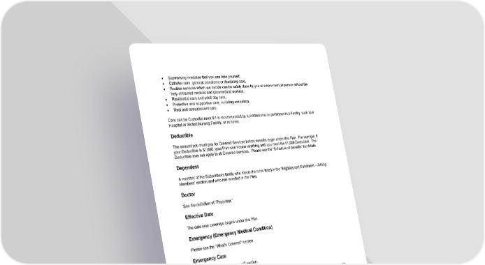 120 • Supervising medicine that you can take yourself, • Catheter care, general colostomy or ileostomy care, • Routine services which we decide can be safely done by you or a non-medical person without the help of trained medical and paramedical workers, • Residential care and adult day care, • Protective and supportive care, including education, • Rest and convalescent care. Care can be Custodial even if it is recommended by a professional or performed in a Facility, such as a Hospital or Skilled Nursing Facility, or at home. Deductible The amount you must pay for Covered Services before benefits begin under this Plan. For example, if your Deductible is $1,000, your Plan won’t cover anything until you meet the $1,000 Deductible. The Deductible may not apply to all Covered Services. Please see the “Schedule of Benefits” for details. Dependent A member of the Subscriber’s family who meets the rules listed in the “Eligibility and Enrollment – Adding Members” section and who has enrolled in the Plan. Doctor See the definition of “Physician.” Effective Date The date your coverage begins under this Plan. Emergency (Emergency Medical Condition) Please see the "What’s Covered" section. Emergency Care Please see the "What’s Covered" section. Employee A person who is engaged in active employment with the Employer and is eligible for Plan coverage under the employment rules of the Employer. The Employee is also called the Subscriber. Employer An Employer who has allowed its Employees to participate in the Plan by acting as the Plan Sponsor or adopting the Plan as a participating Employer by executing a formal document that so provides. The Employer or other organization has an Administrative Services Agreement with the Claims Administrator to administer this Plan. Excluded Services (Exclusion) Health care services your Plan doesn’t cover.